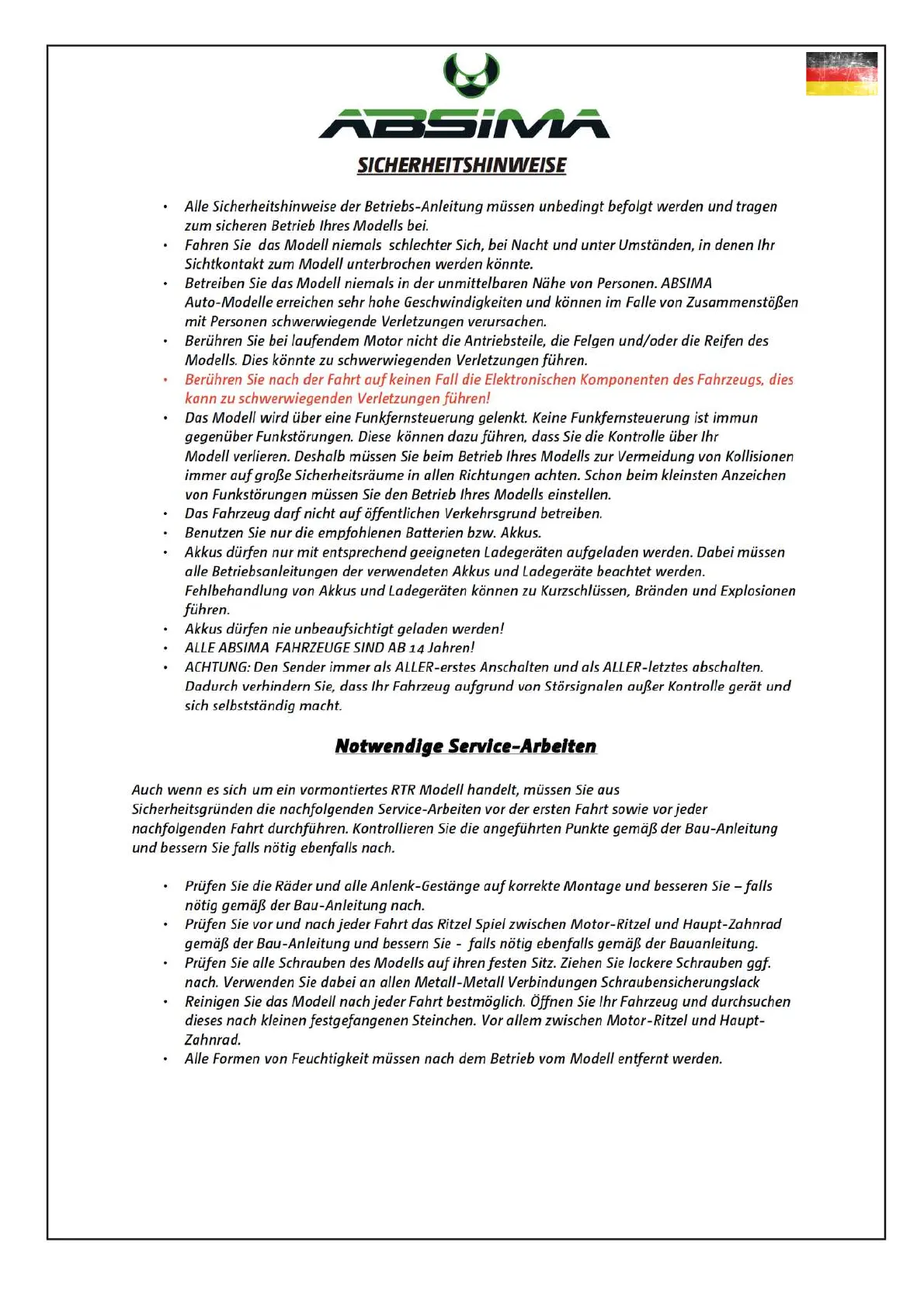 Absima ADB 1.4 - SICHERHEITSHINWEISE; Notwendige Service-Arbeiten