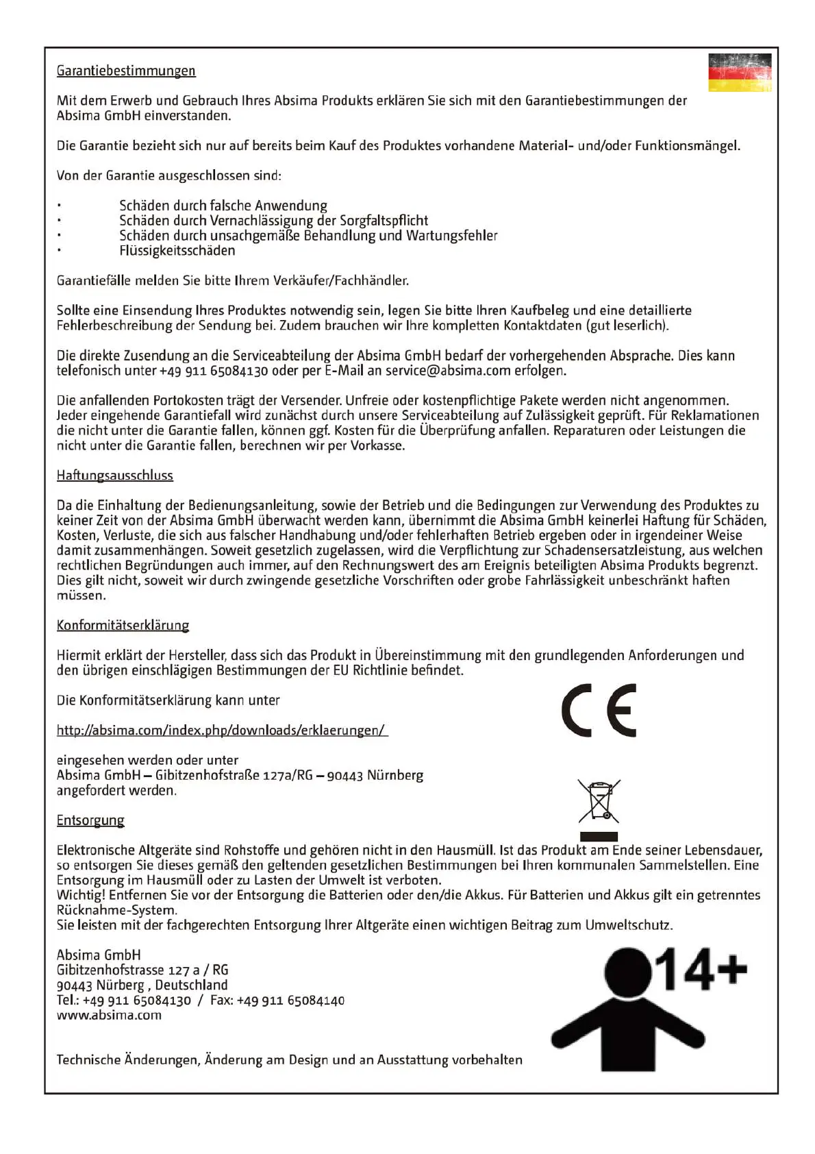 Absima ADB 1.4 - Garantiebestimmungen; Haftungsausschluss; Konformitätserklärung; Entsorgung