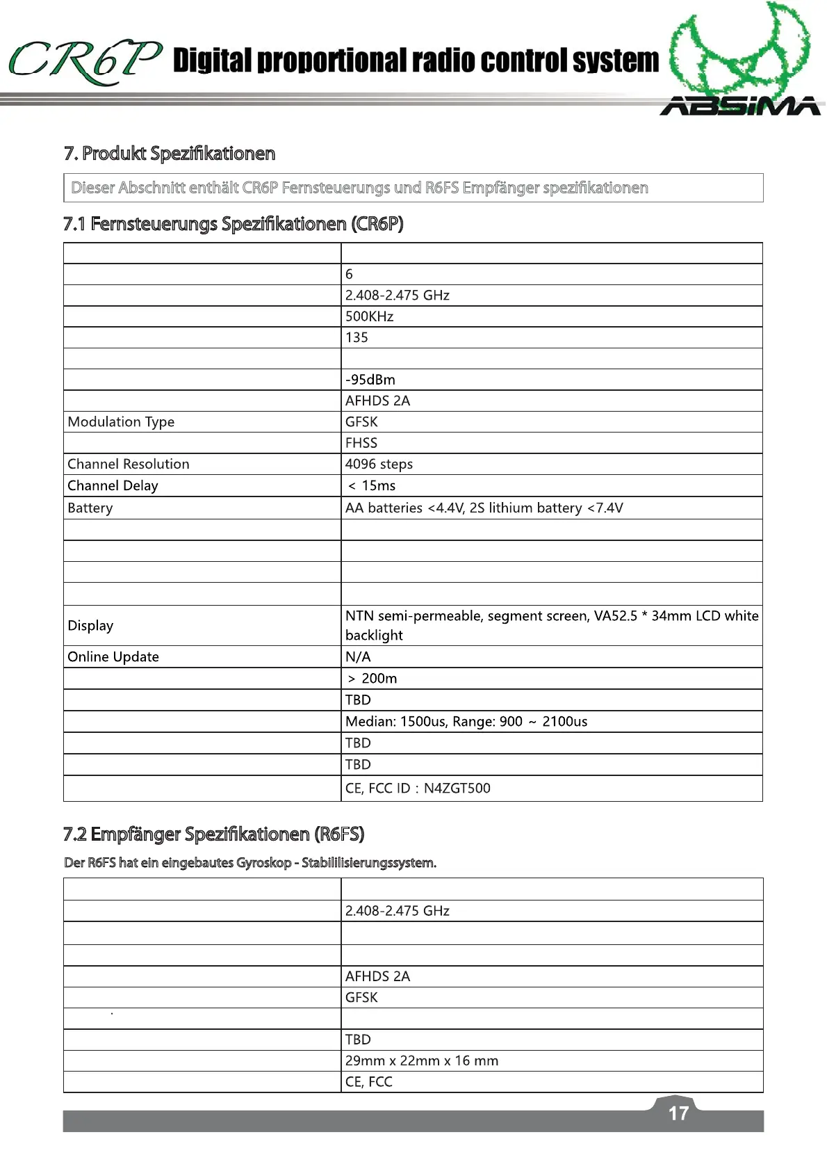 Dieser Abschnitt enthält CR6P Fernsteuerungs und R6FS Empfänger spezikationen