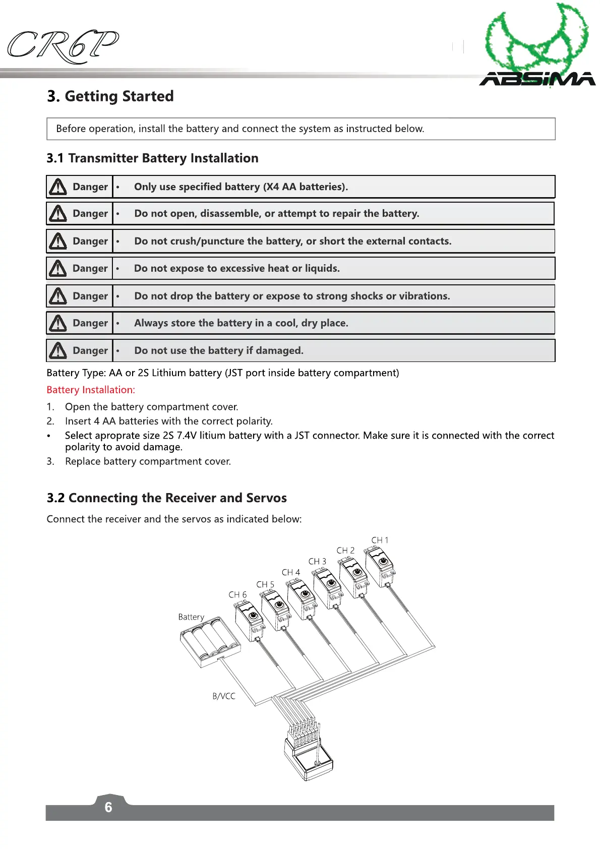 Absima CR6P - Getting Started; Transmitter Battery Installation; Connecting the Receiver and Servos