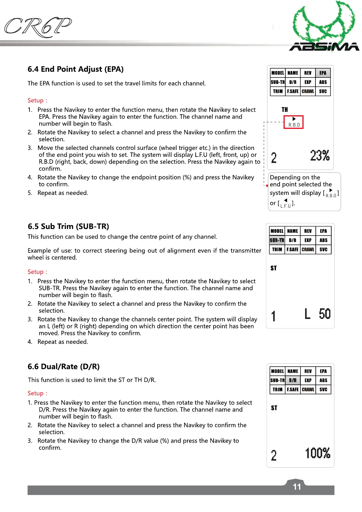 Absima CR6P - End Point Adjust (EPA); Sub Trim (SUB-TR); Dual;Rate (D;R)