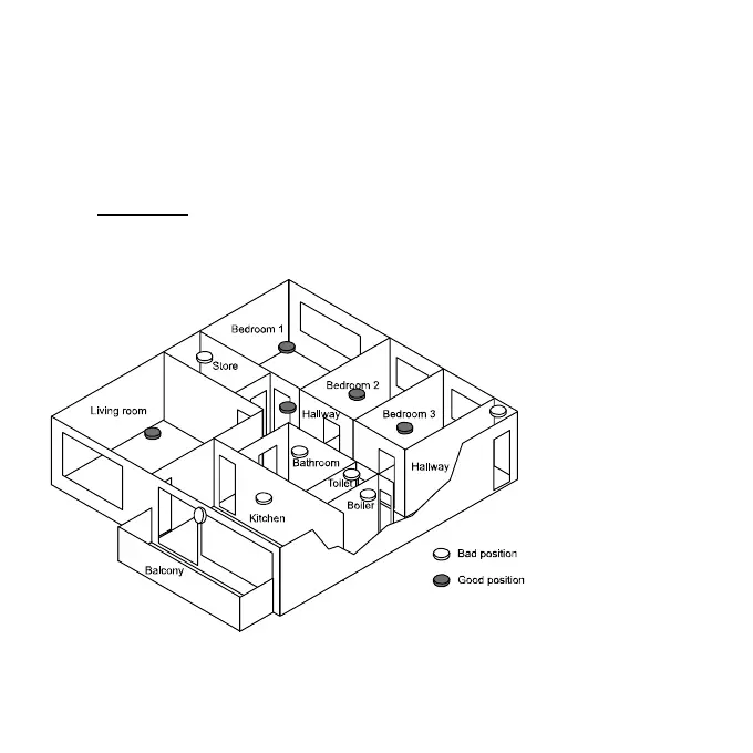 De tre følgende billeder viser gode og dårlige positioner for røgalarmer. Billede 7 viser en lejlighed.