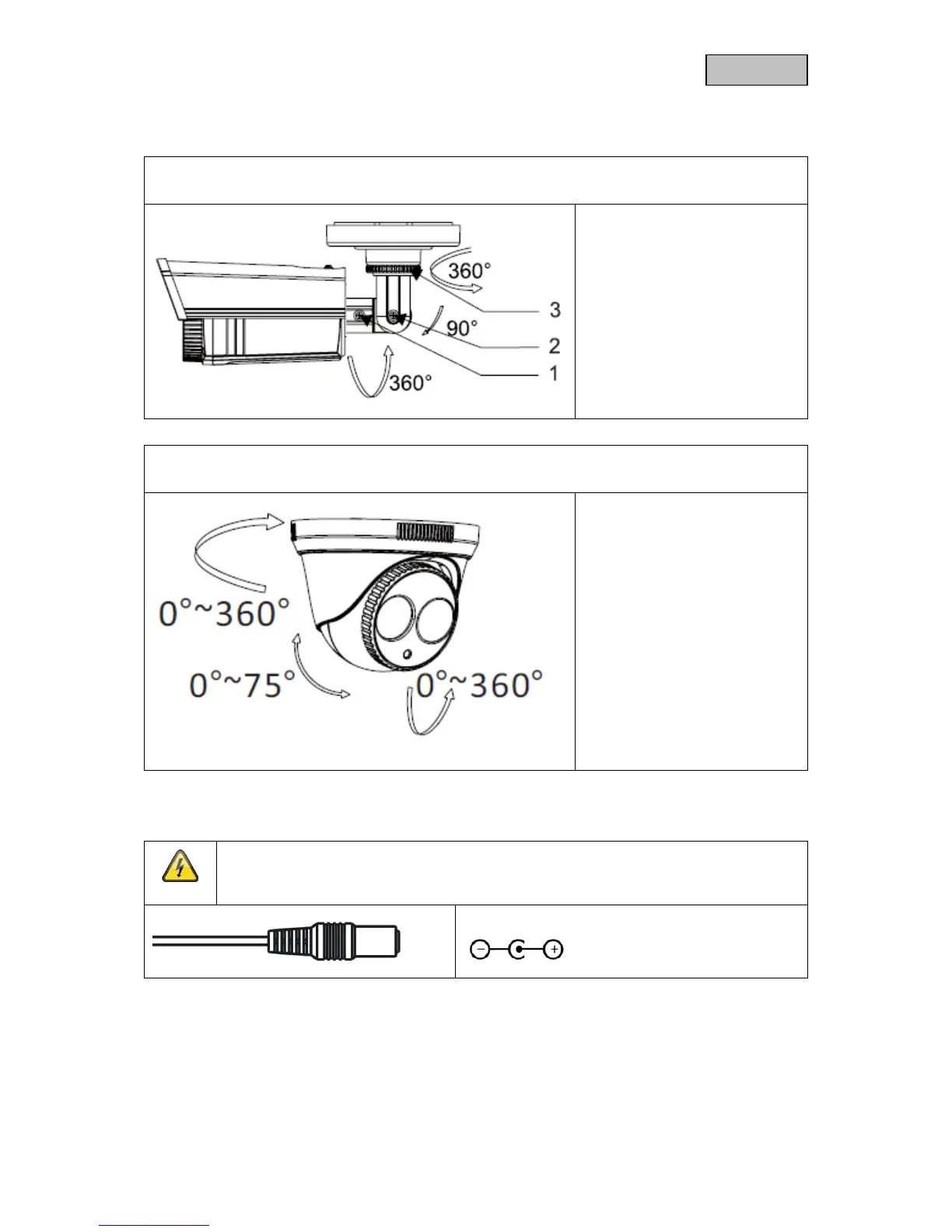 De camera's worden gevoed met 12 VDC-voedingsspanning. De polariteit van de gelijkspanning moet