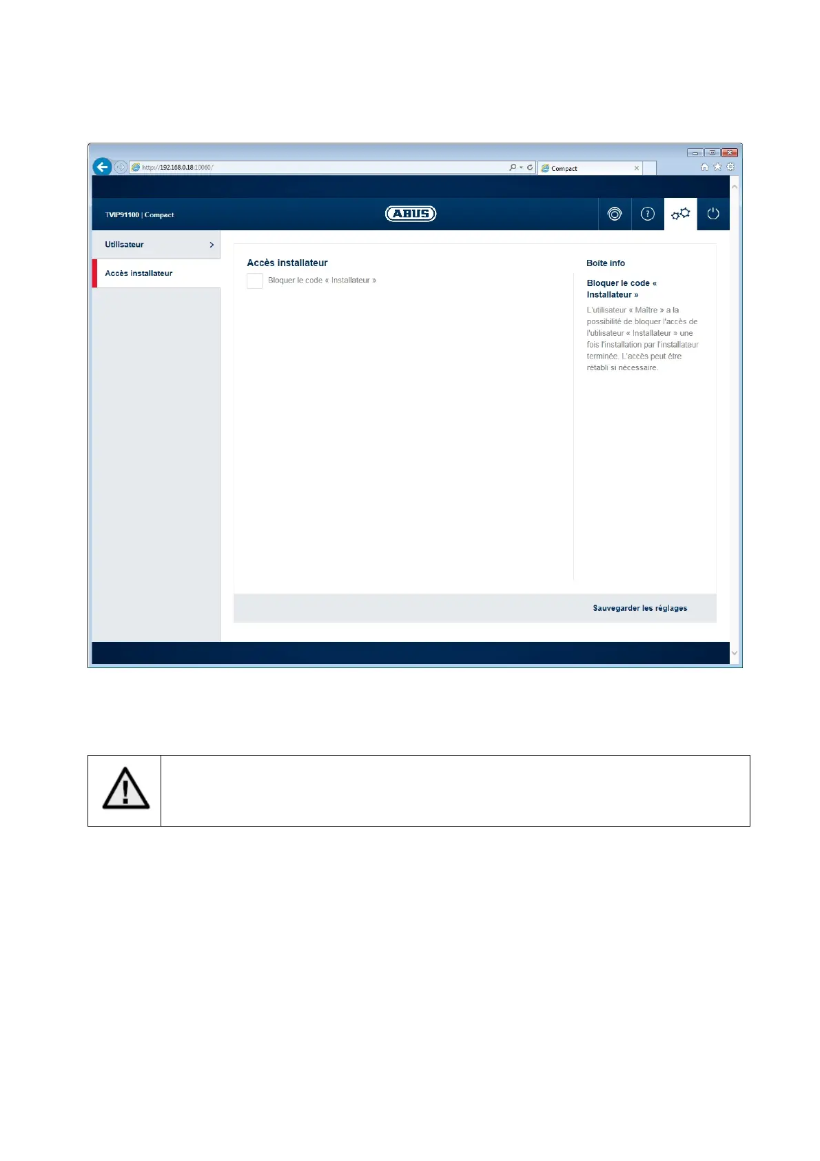 Bloquer l'utilisateur « installateur » : en cochant cette case, l'accès de l'utilisateur « installateur »
