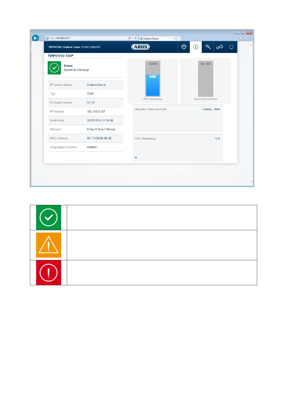 Dans la zone supérieure gauche, l'état général du système est représenté par un symbole.