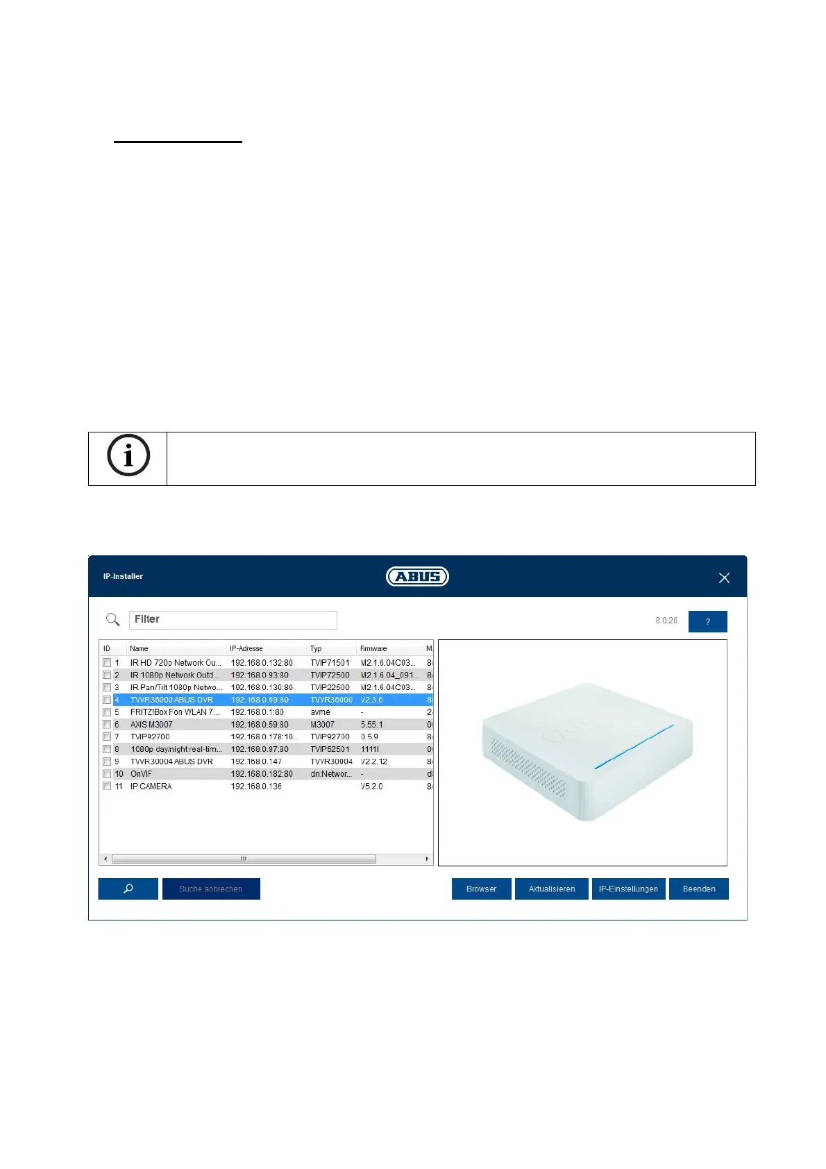 Install and start up the ABUS IP Installer using the enclosed software CD (or alternatively using