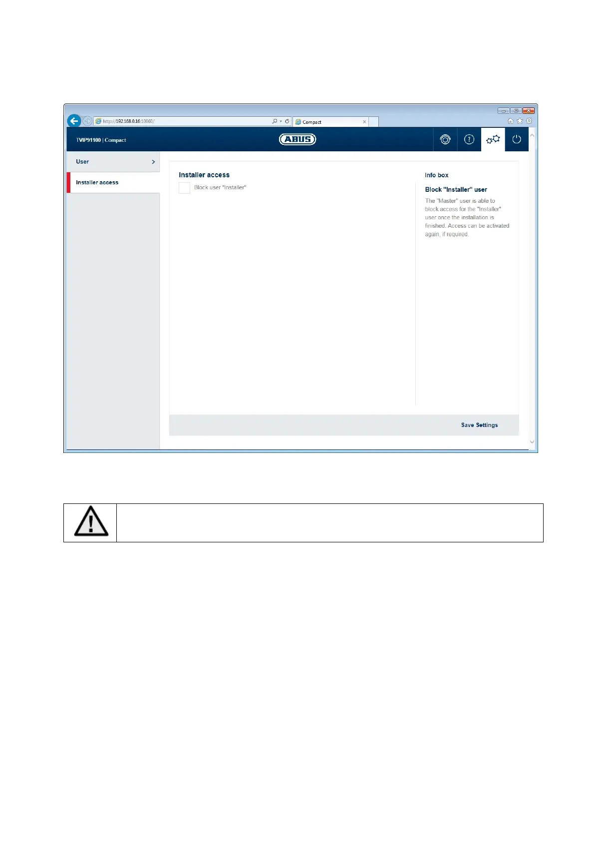Block user "installer": ticking the box will block access for the user "installer". Only the