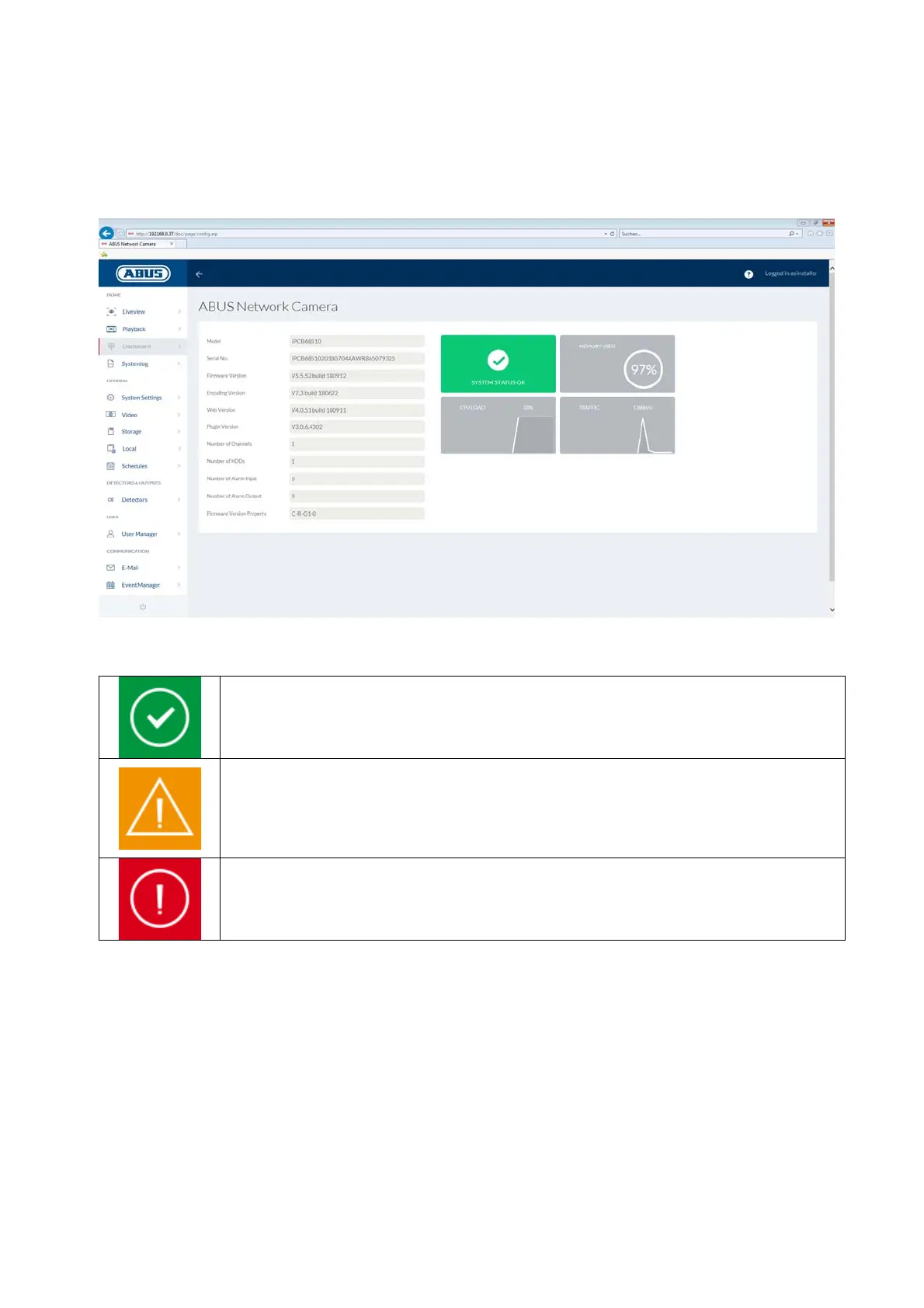 The dashboard displays general information about the camera, e.g. installed firmware version or