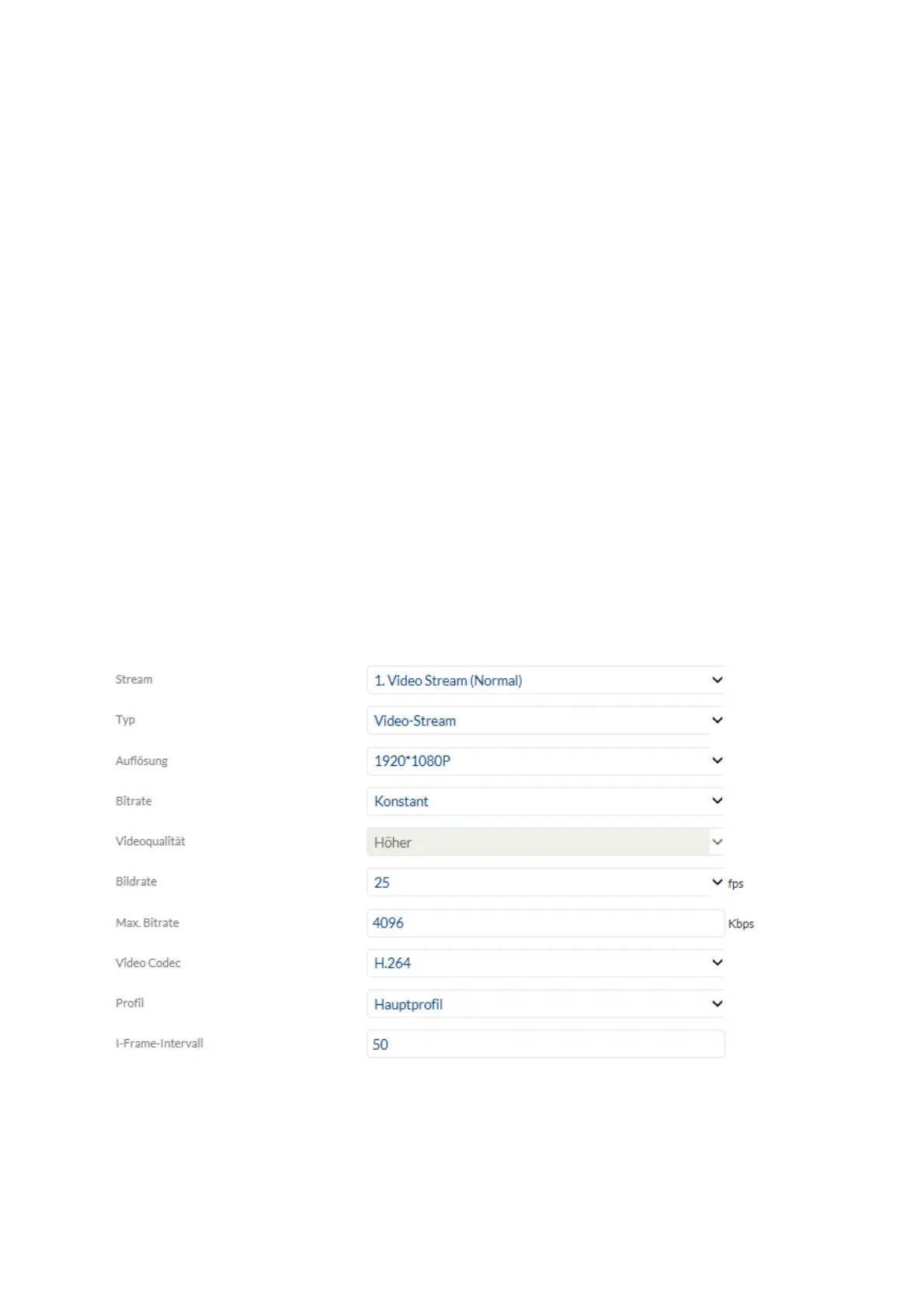 I-Frame Bildintervall: Wählen Sie wie oft ein I-Frame (nur bei H.264) gesendet werden soll.