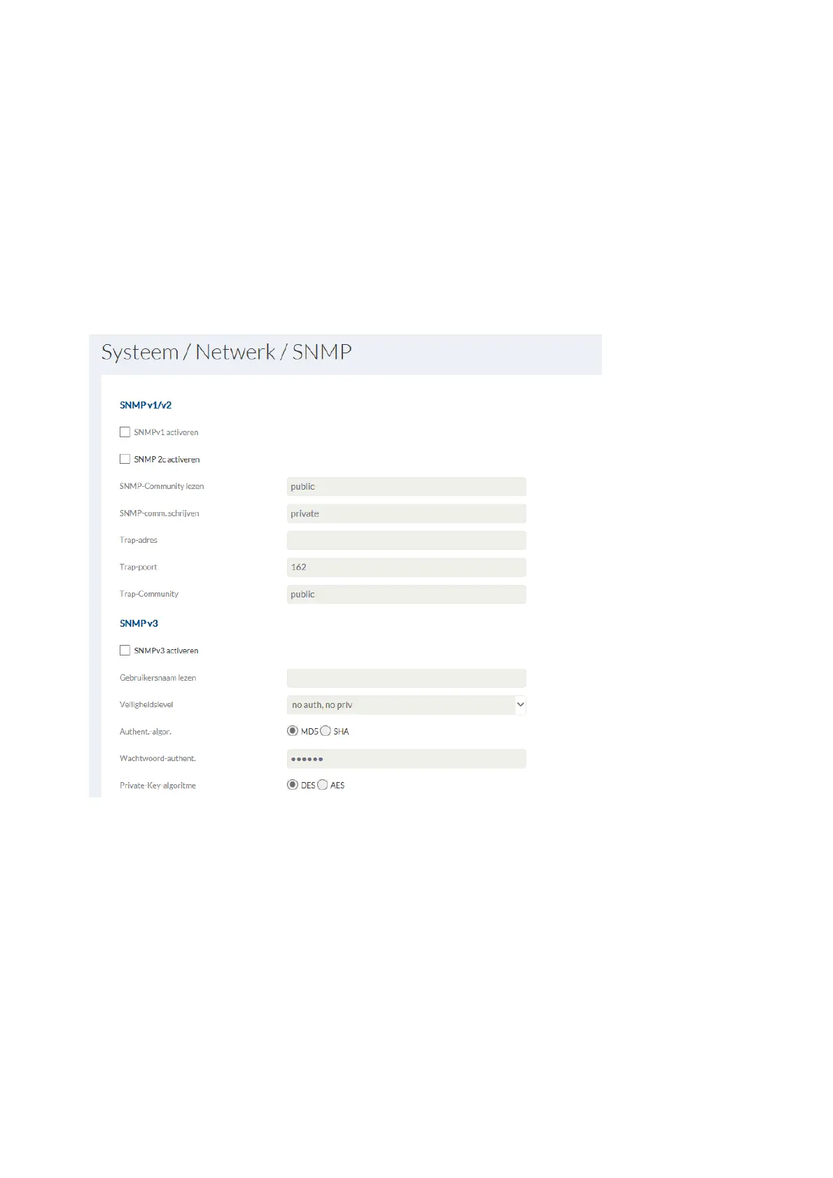 no auth, no priv.: Geen authenticatie, codering