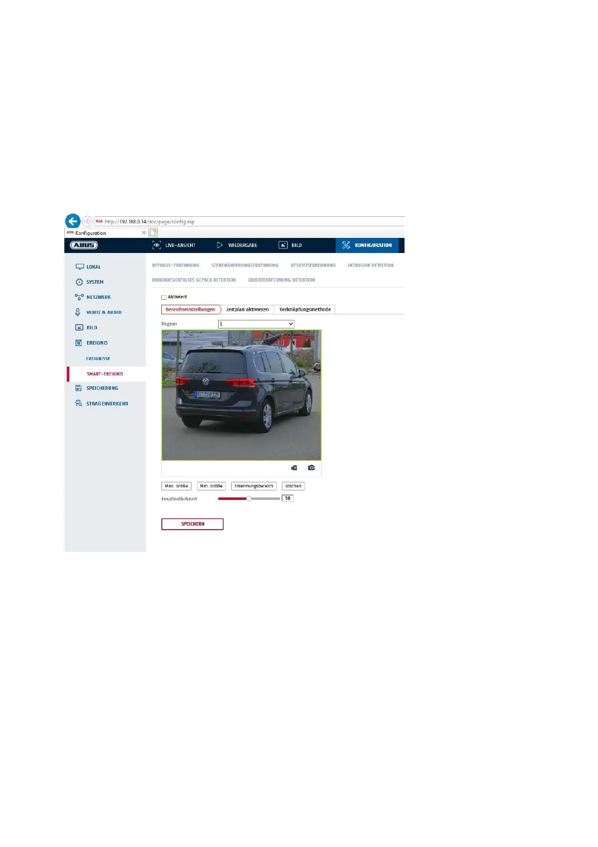 Detekteringsområde: Via denne knap kan det område i videobilledet, der skal overvåges, tegnes (firkantet