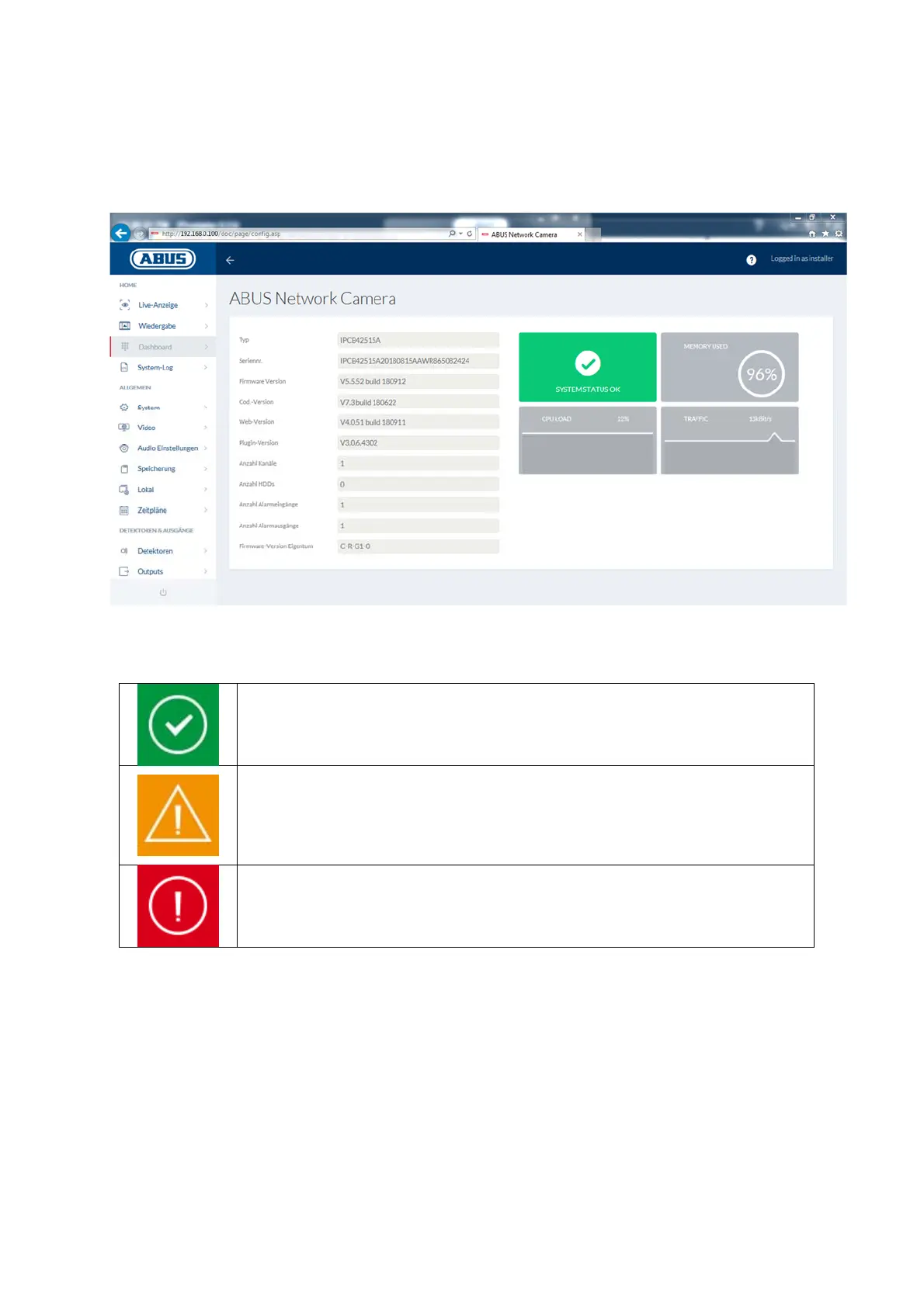 Das Dashboard zeigt generelle Informationen über die Kamera an, z.B. installierte Firmware-
