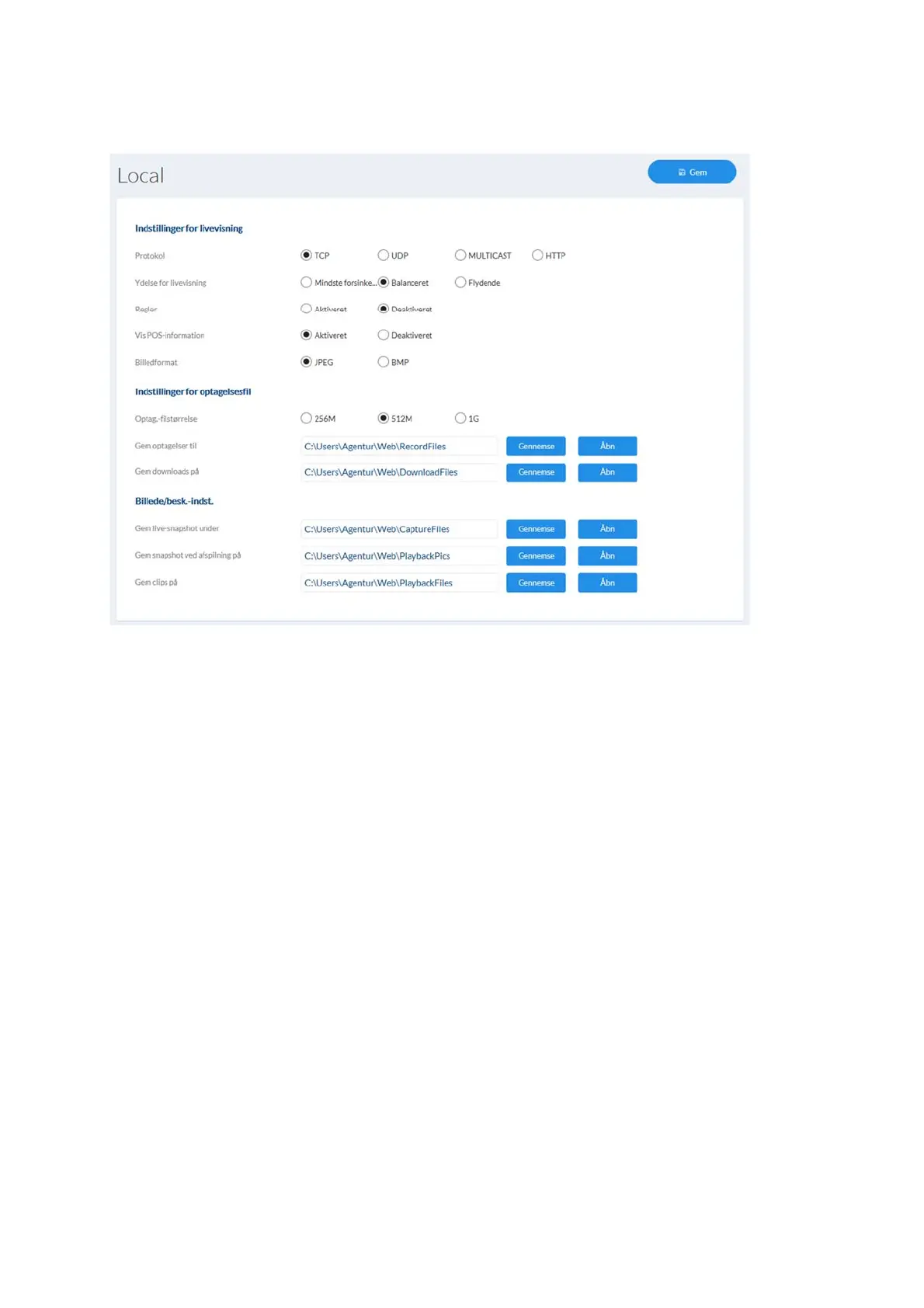 Lagring af optagelser på: Vælg stien til videooptagelsen.