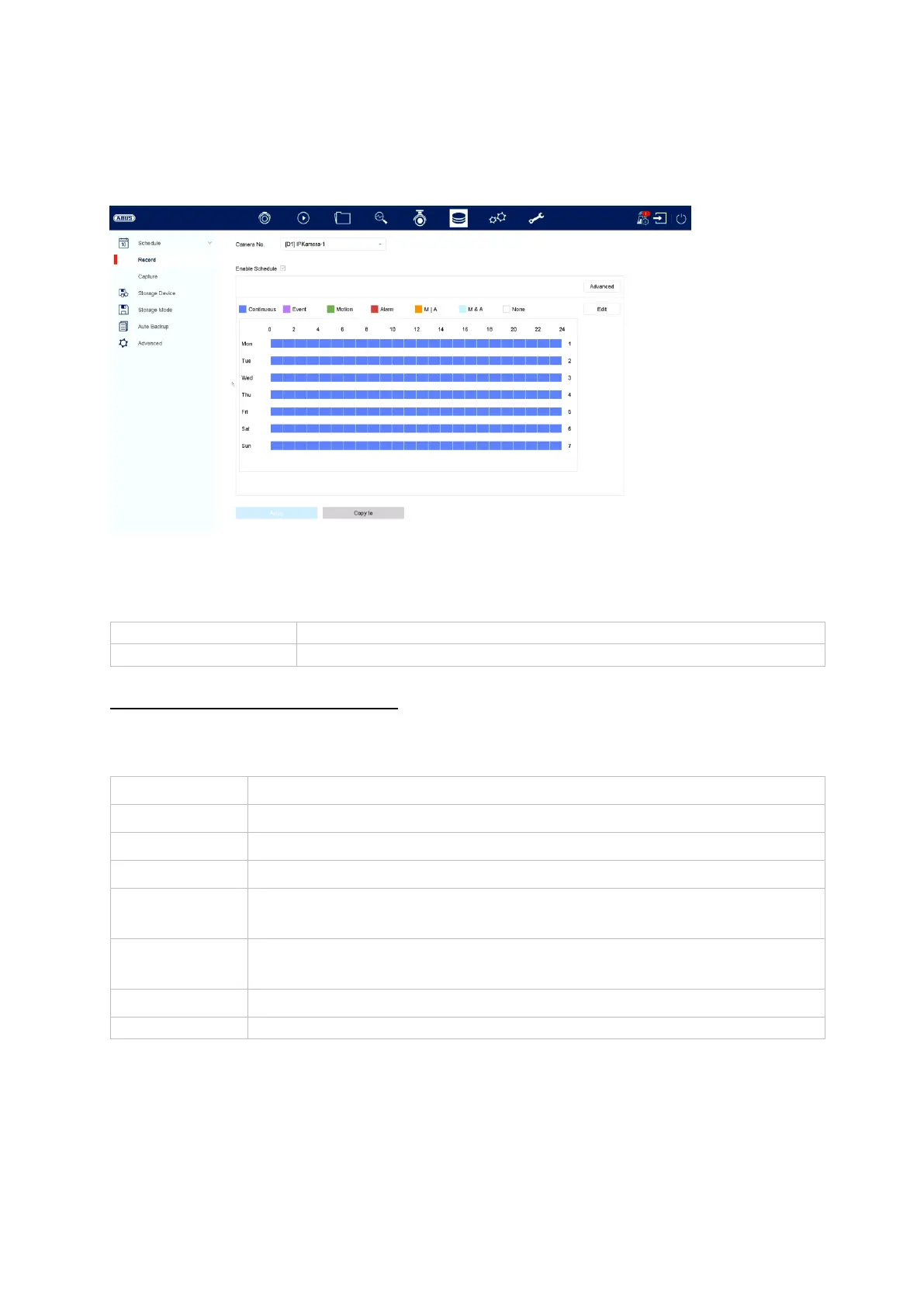 Abus NVR10030P - Storage Settings; Recording Schedule; Video Recording Plan