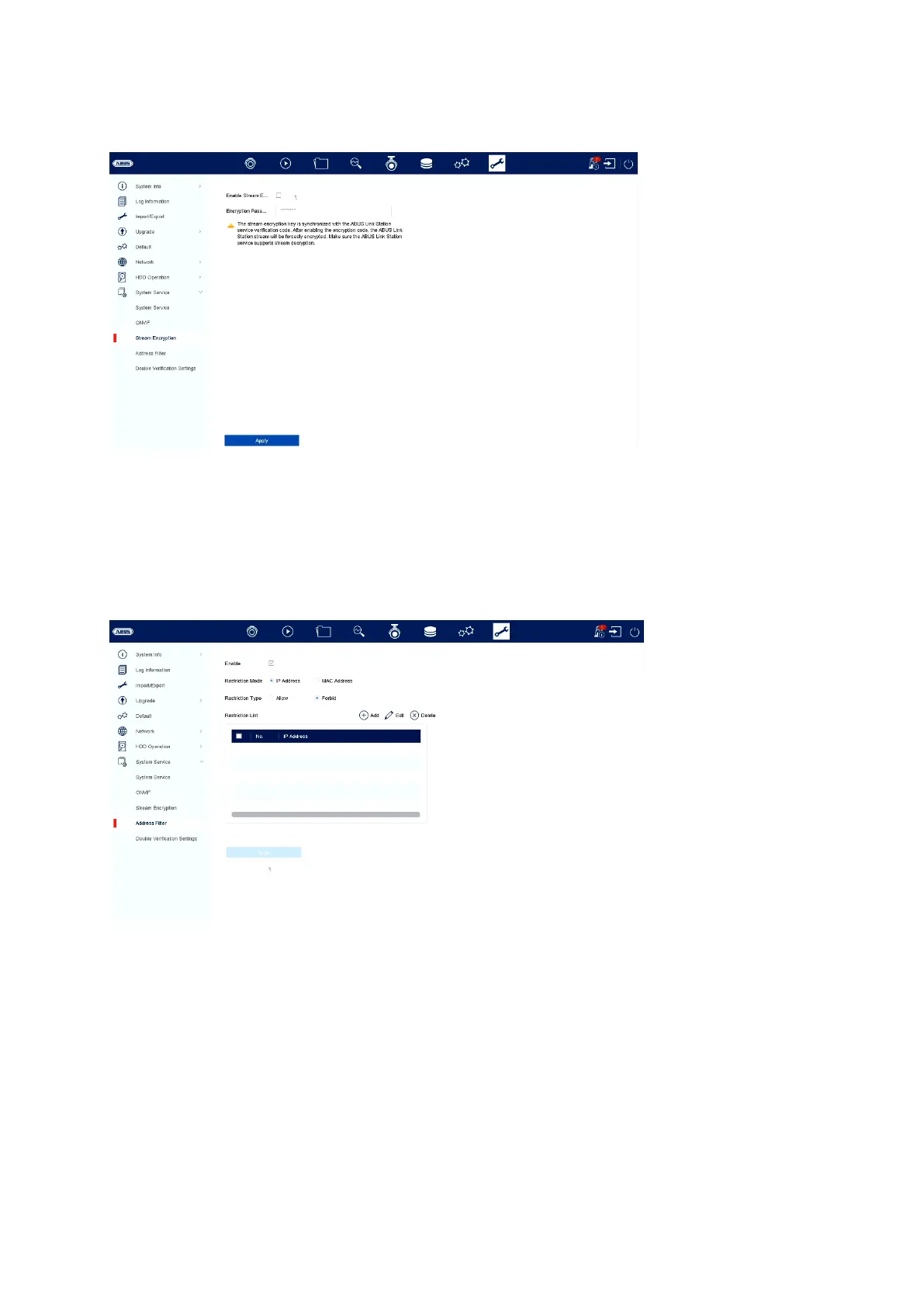 Here you can activate/deactivate stream encryption for access via the ABUS LINK