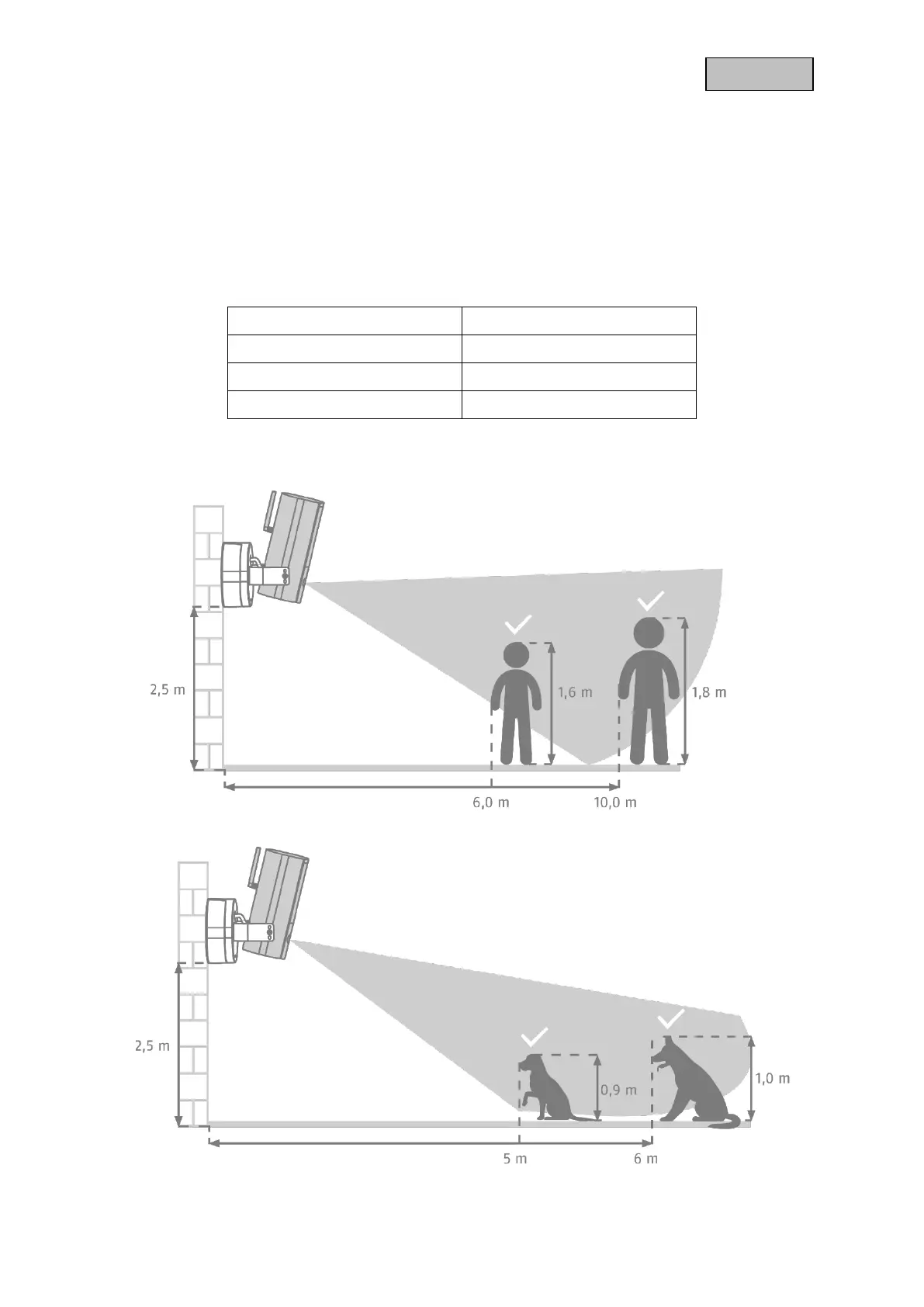 Intelligent Object Detection works reliably over the following range, motion detection may occur outside