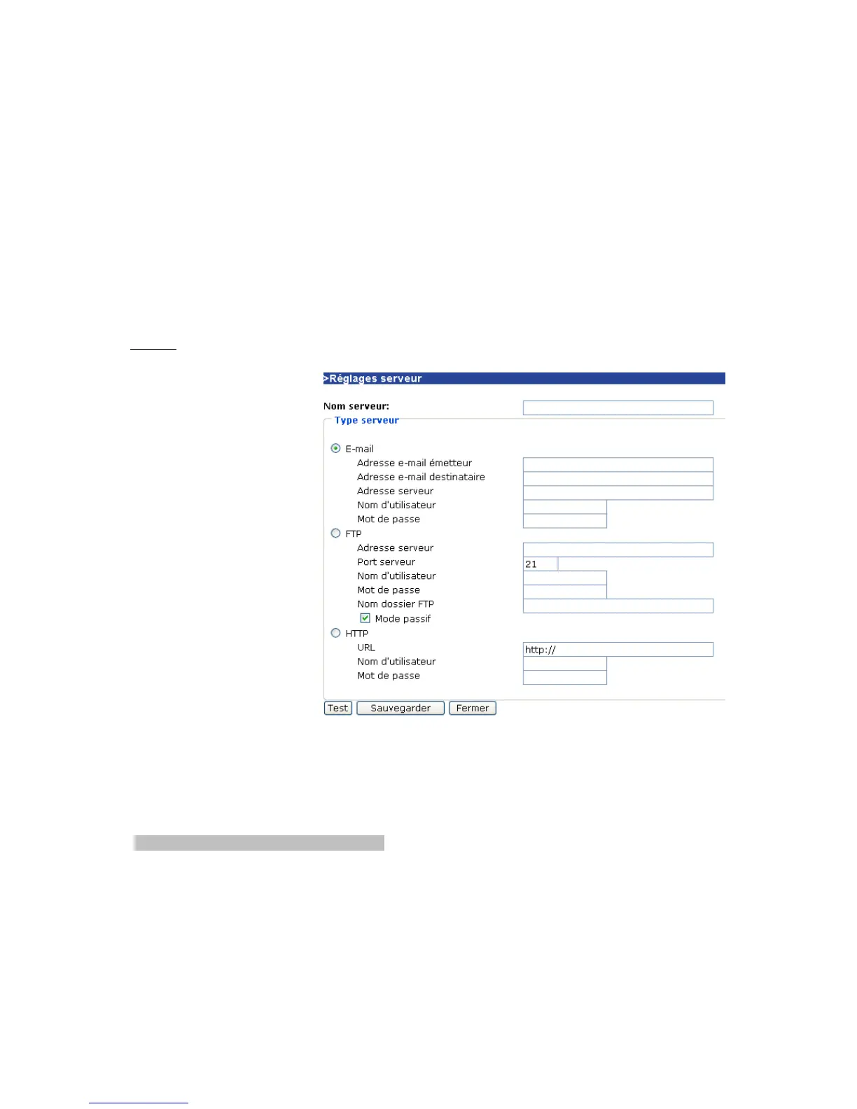 „Adresse serveur“ La désignation des domaines ou l’adresse IP du serveur FTP externe.