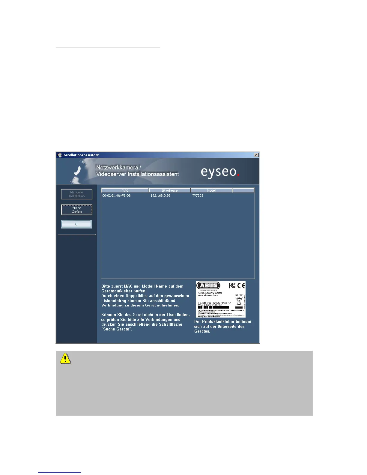 Nach dem Start des Assistenten sucht dieser nach angeschlossenen Eyseo Netzwerkkameras und