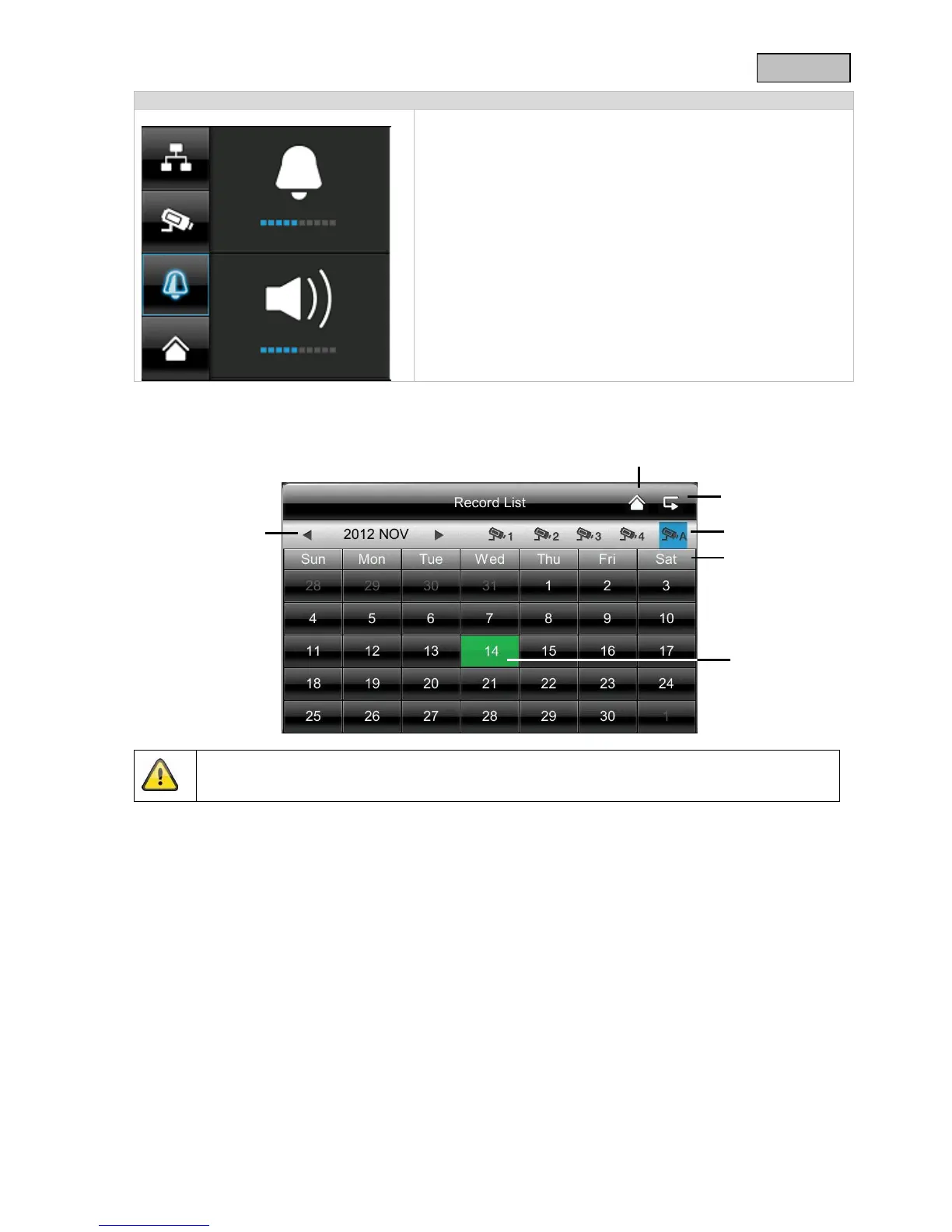 Set the volume of the alarm tone (bell symbol) or camera tone