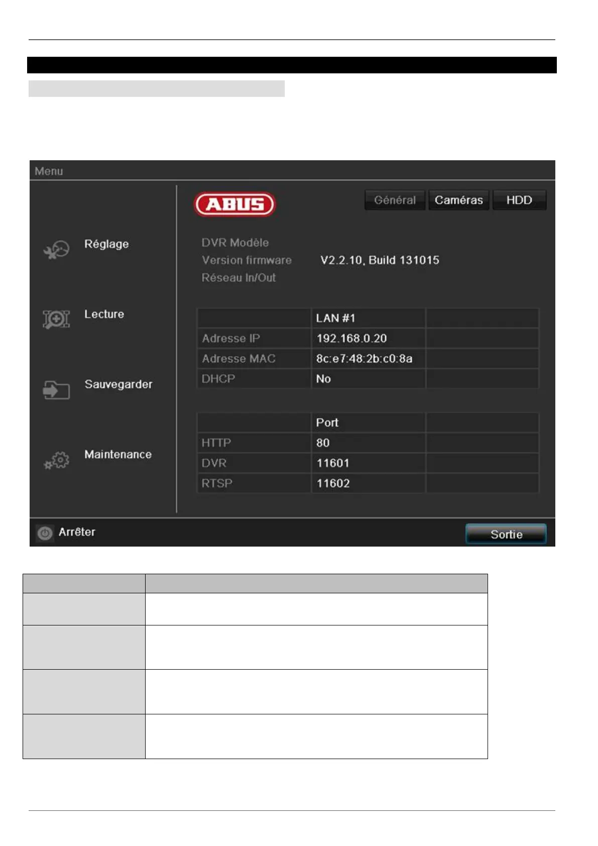 Permet d’accéder aux menus Configuration, Caméra, Enregistrement,