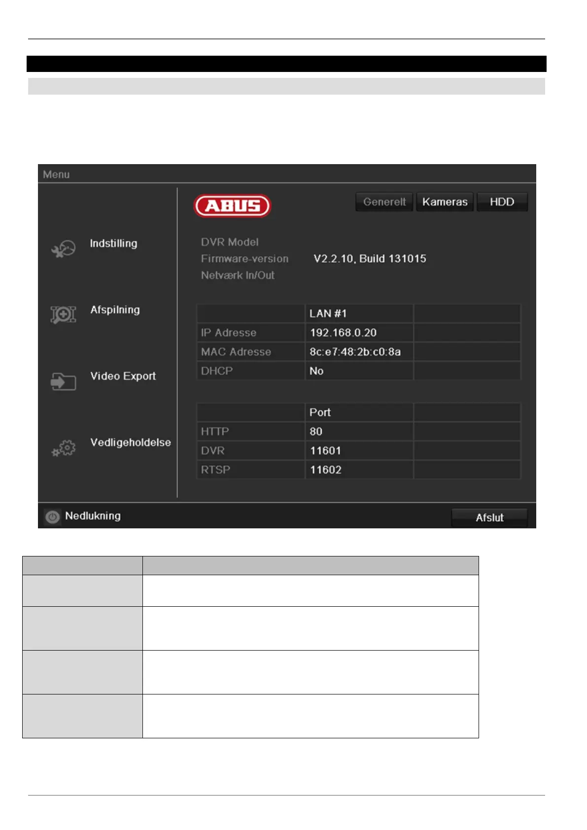 Leder videre til menuerne Konfiguration, Kamera, Optagelse, HDD,