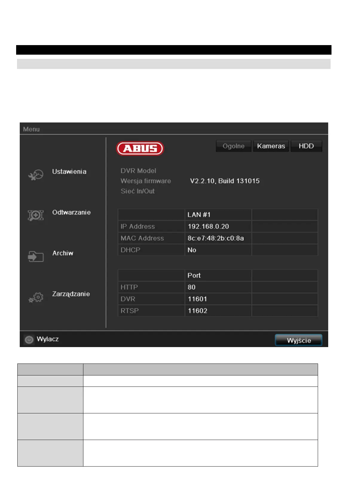 Przekierowuje do menu Konfiguracja, Kamera, Zapis, HDD, Odtwarzanie.