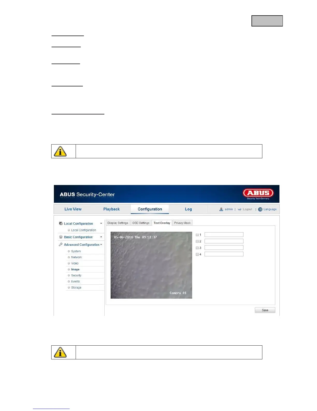 You can display up to four texts in the camera image. The maximum length for the texts is 45 characters.