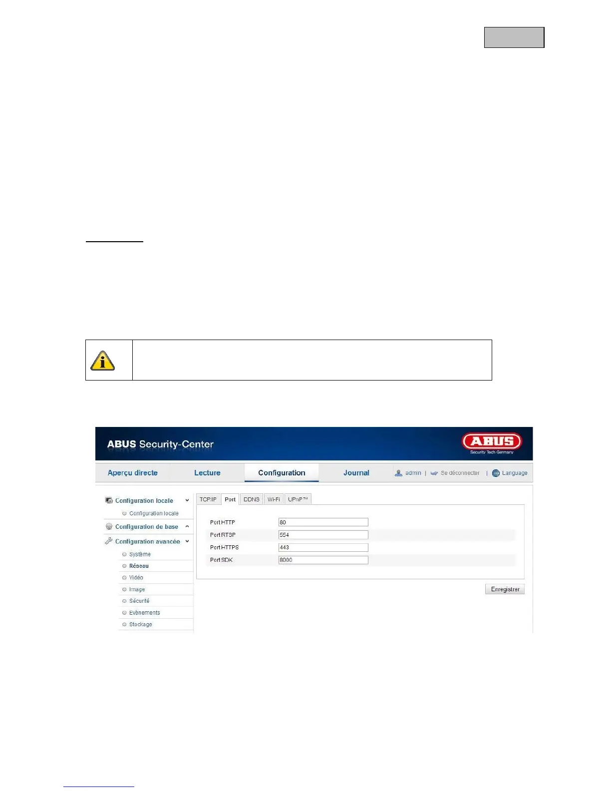 Si vous souhaitez avoir un accès externe au caméra, les ports suivants doivent être configurés.