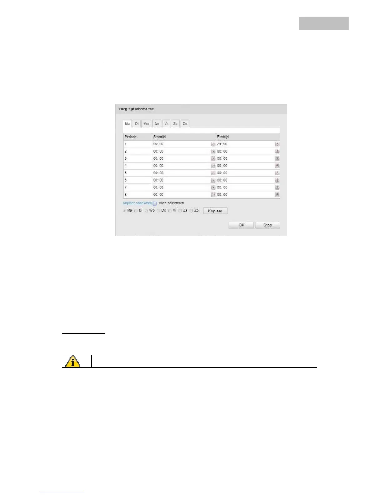 de start- en eindtijd aan. Om een bewegingsdetectie voor de gehele dag in te richten, selecteert u als