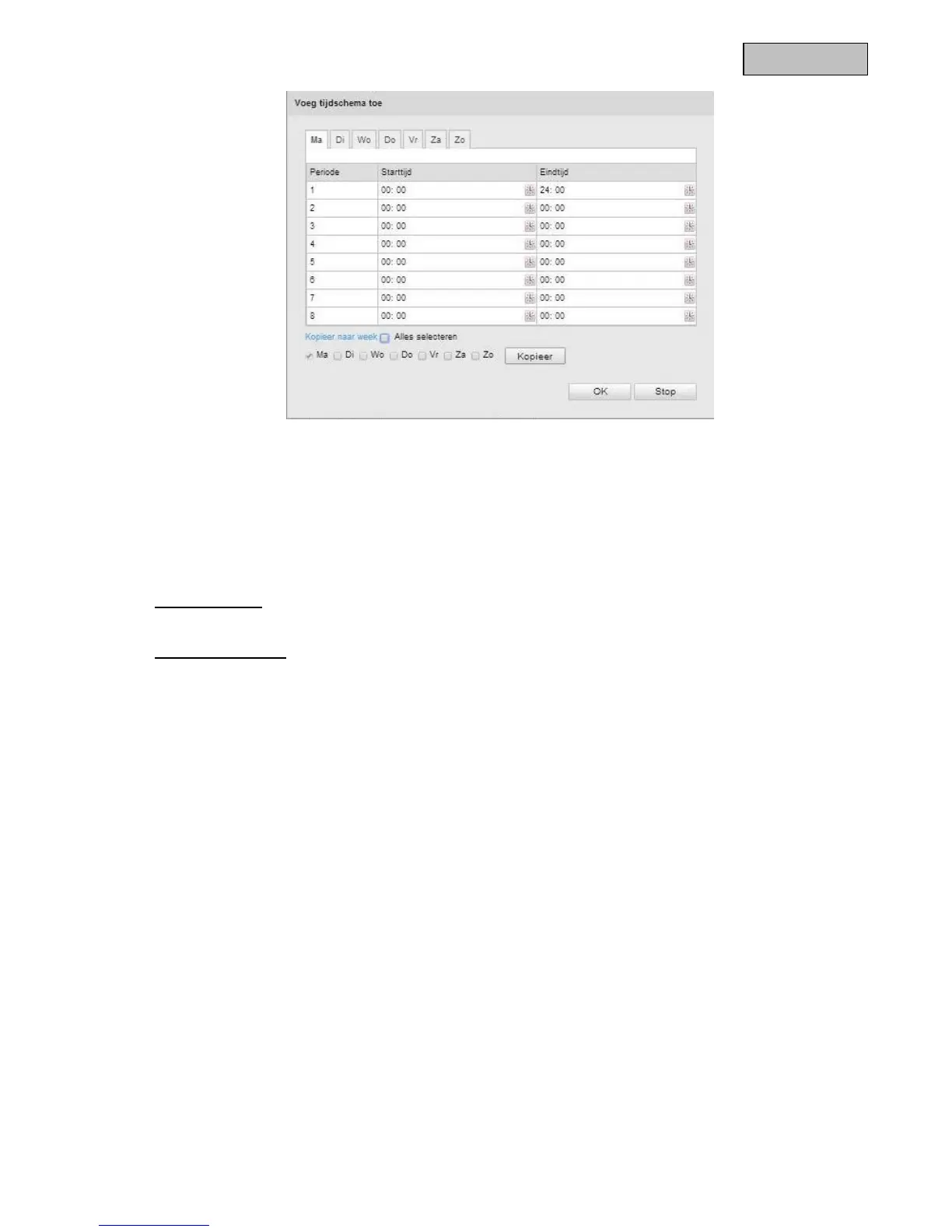 eindtijd aan. Om een bewaking voor de gehele dag in te richten, selecteert u als starttijd 00:00 en als
