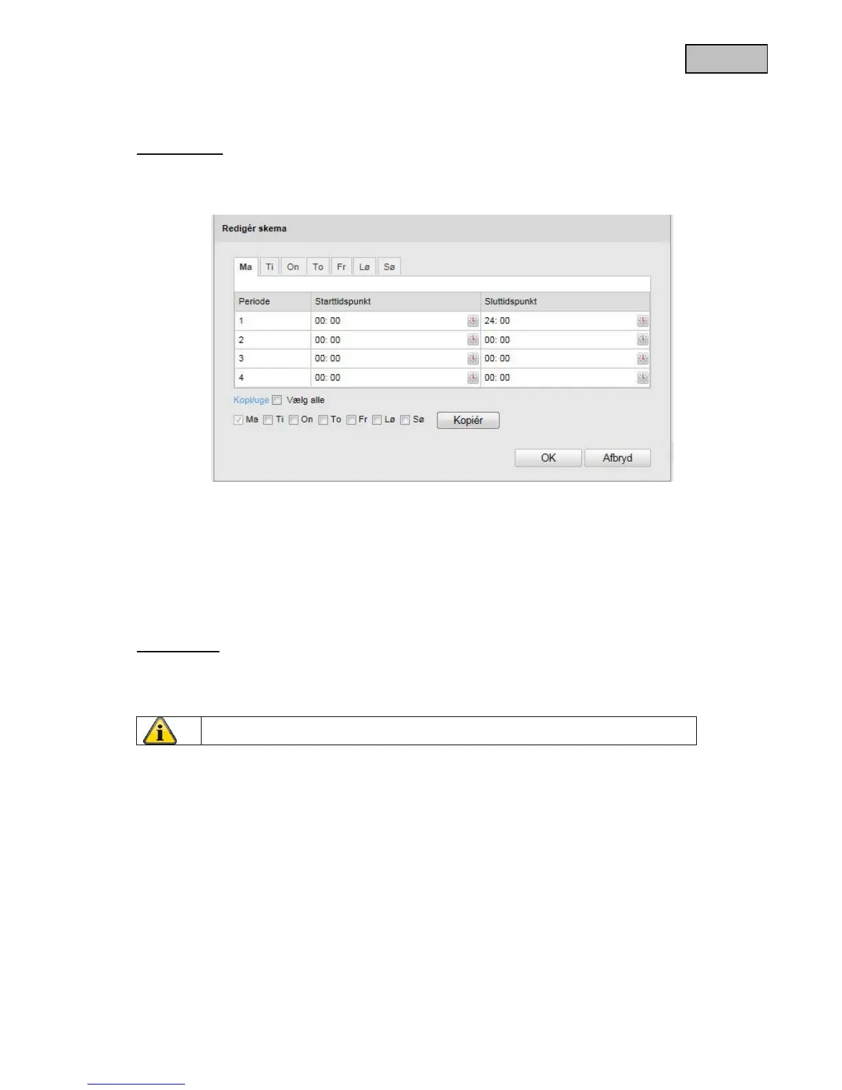 kopiere bevægelsesgenkendelsen over i andre ugedage vælger du ugedagen og klikker på „Kopi/uge“.