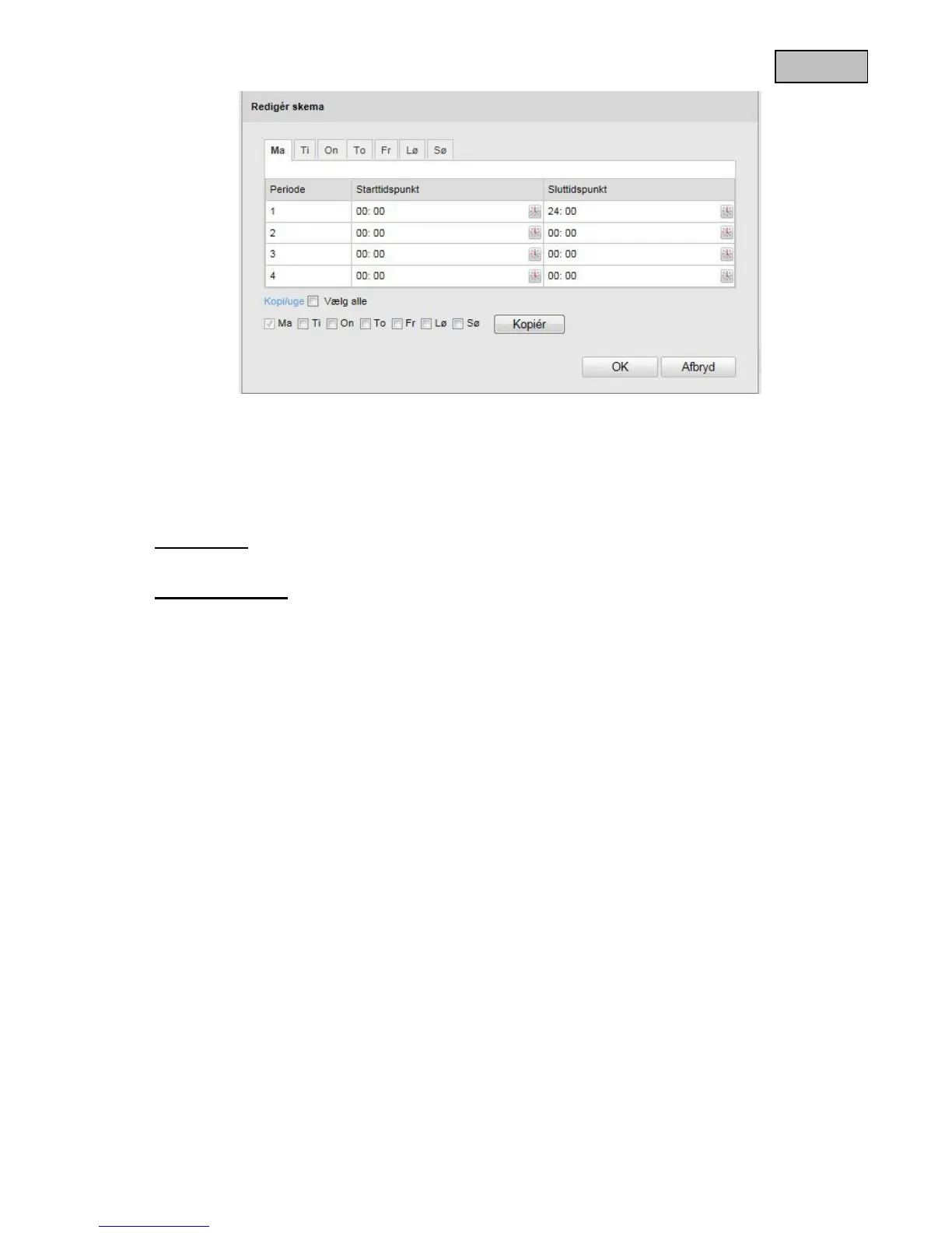 klik på „Kopi/uge“ for at kopiere indstillingerne til andre ugedage.