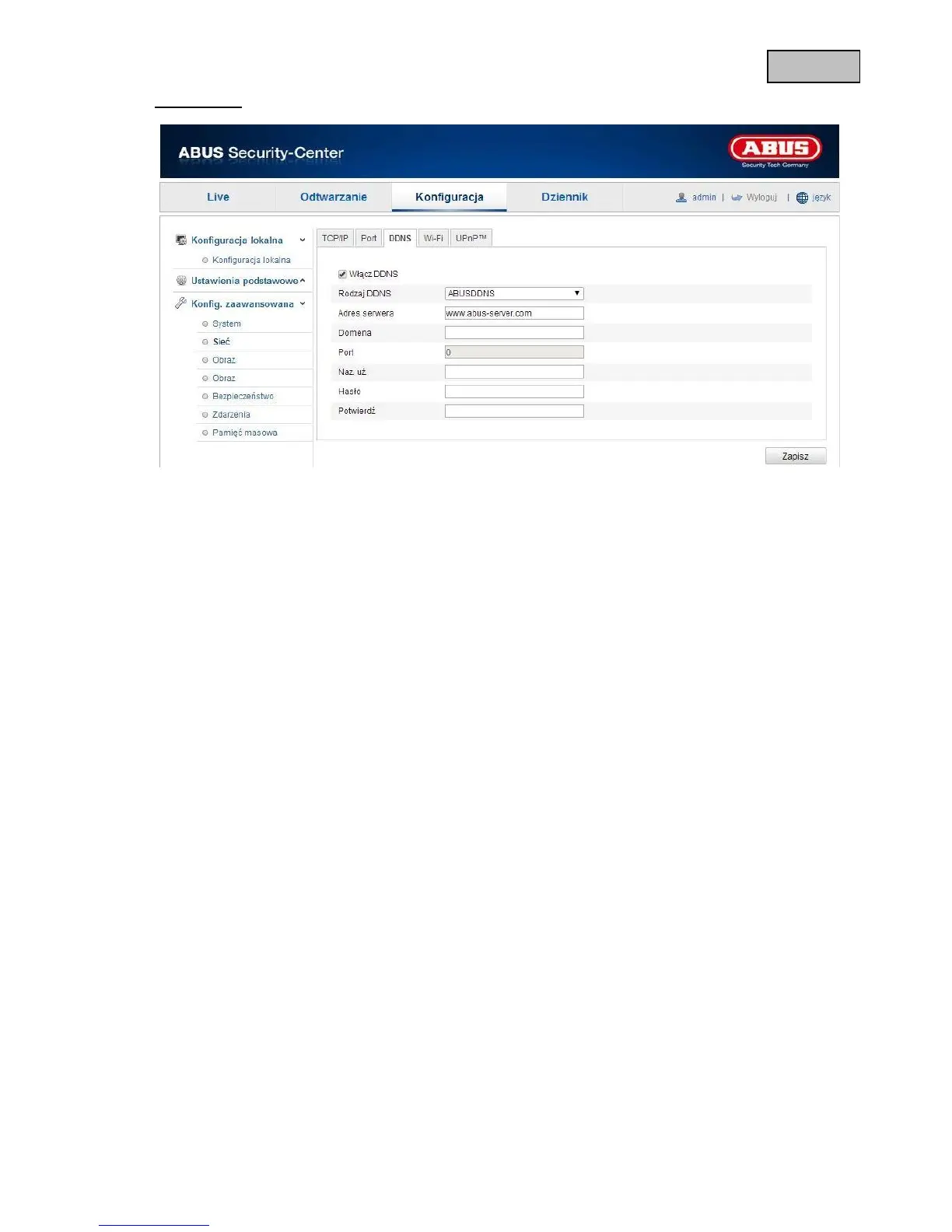 Zaznacz pole wyboru „Uaktywnij DDNS”, a następnie wybierz jako typ DDNS „ABUS DDNS”