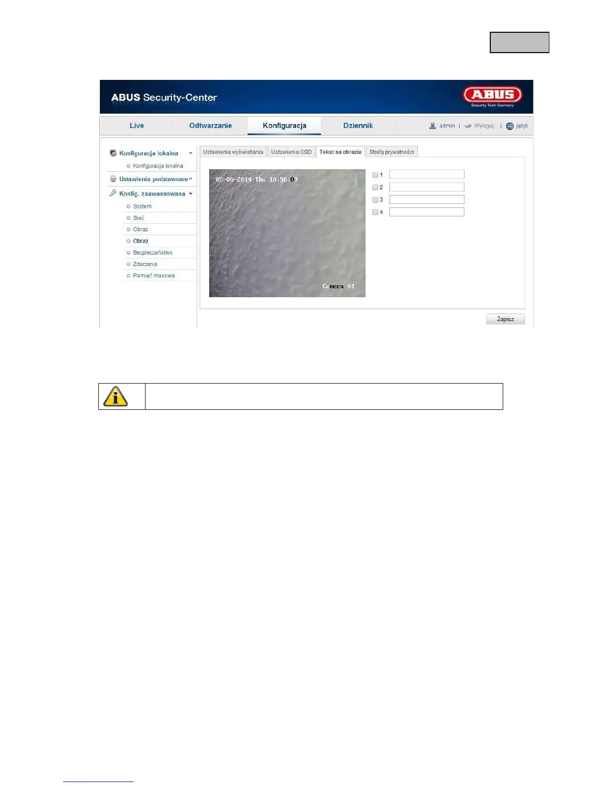 Istnieje możliwość pokazania na obrazie kamery maksymalnie czterech tekstów o maksymalnej długości