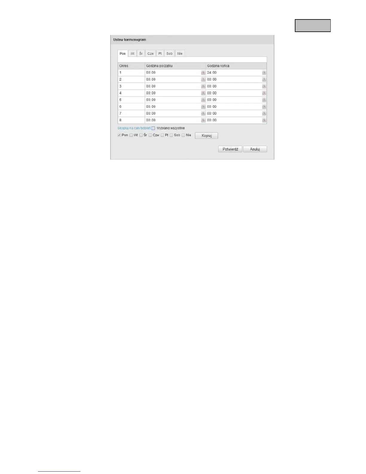 wszystkie”. Aby skopiować ustawienia do innych dni tygodnia, wybierz dzień tygodnia i kliknij „Kopiuj”.