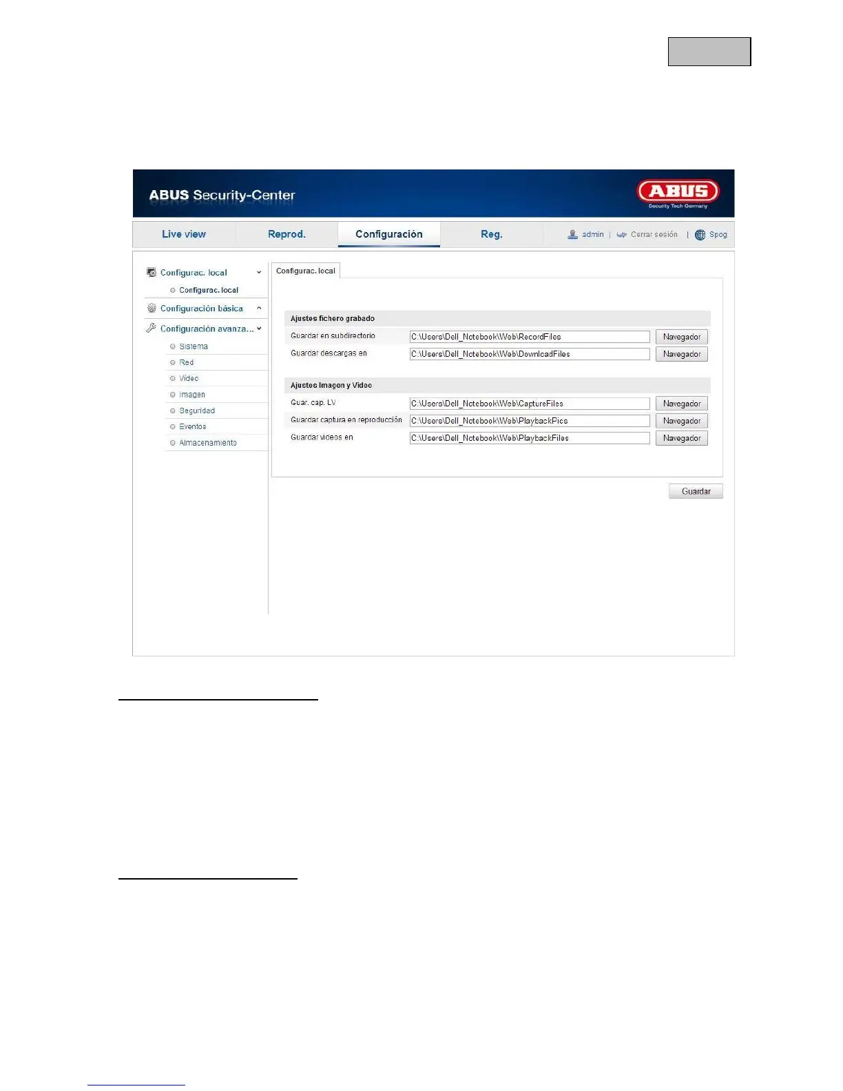 En el punto de menú “Configuración local” puede llevar a cabo los ajustes para la visión en directo, ruta de