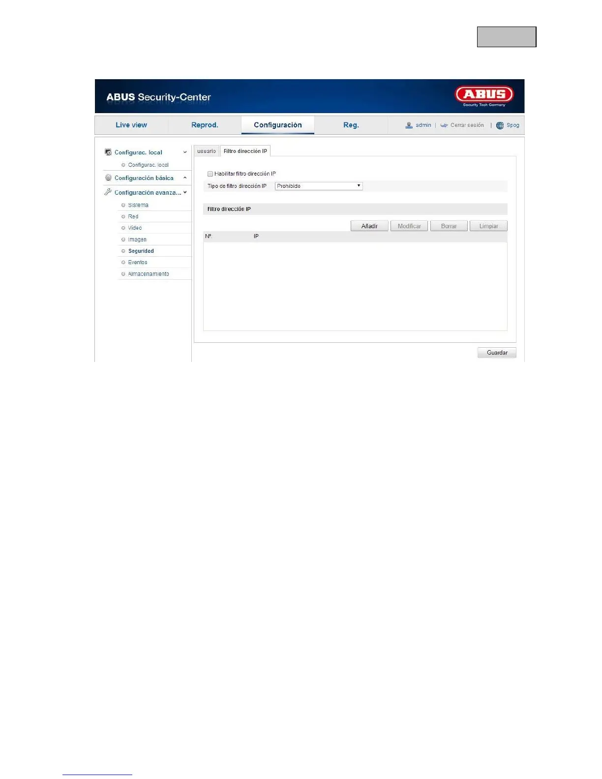 Autorizado: Las direcciones IP definidas más abajo se aceptan para acceder a la cámara.