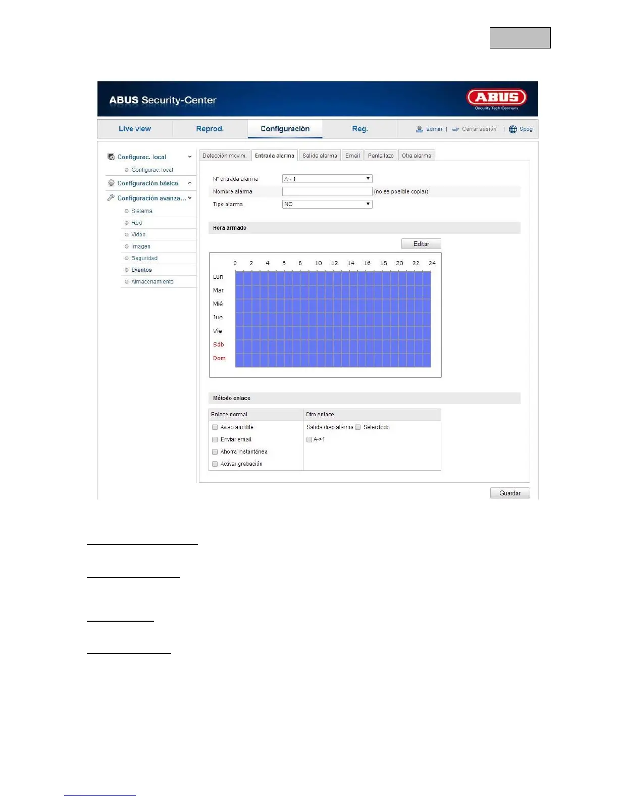 En este punto de menú se puede configurar la entrada de alarma de la cámara.