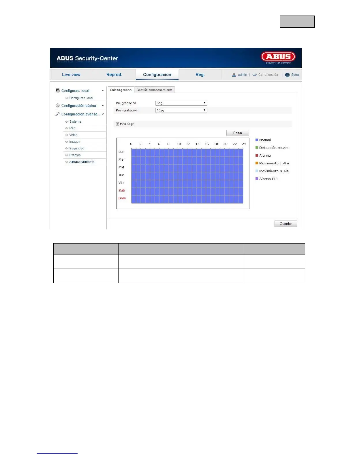 Abus TVIP11560 - Guardar en Memoria; Horario de Grabación; Administración de Memoria