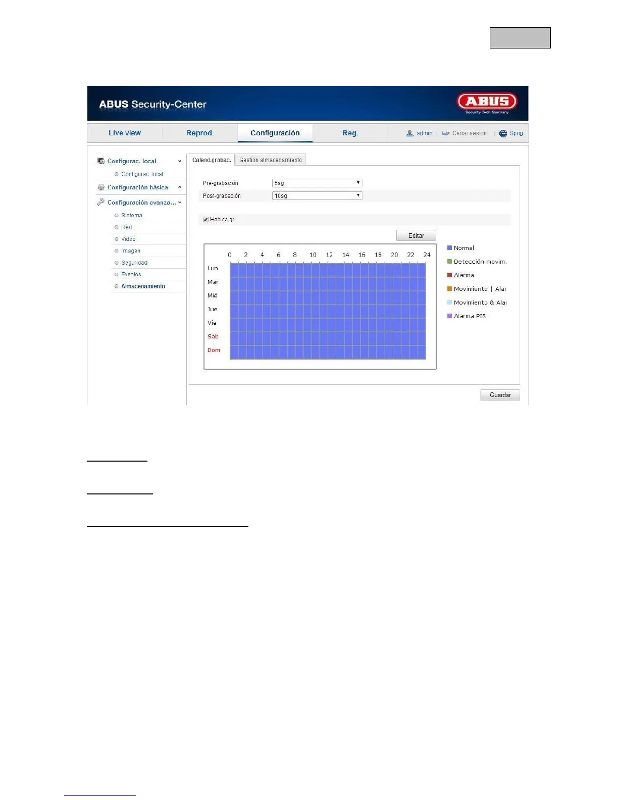 Aquí se pueden configurar las grabaciones con activación horaria y con activación por evento para