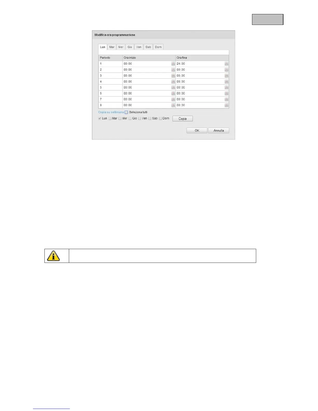 memorizzare precisi intervalli di tempo, inserire l’ora di inizio e di fine. Per configurare la videosorveglianza