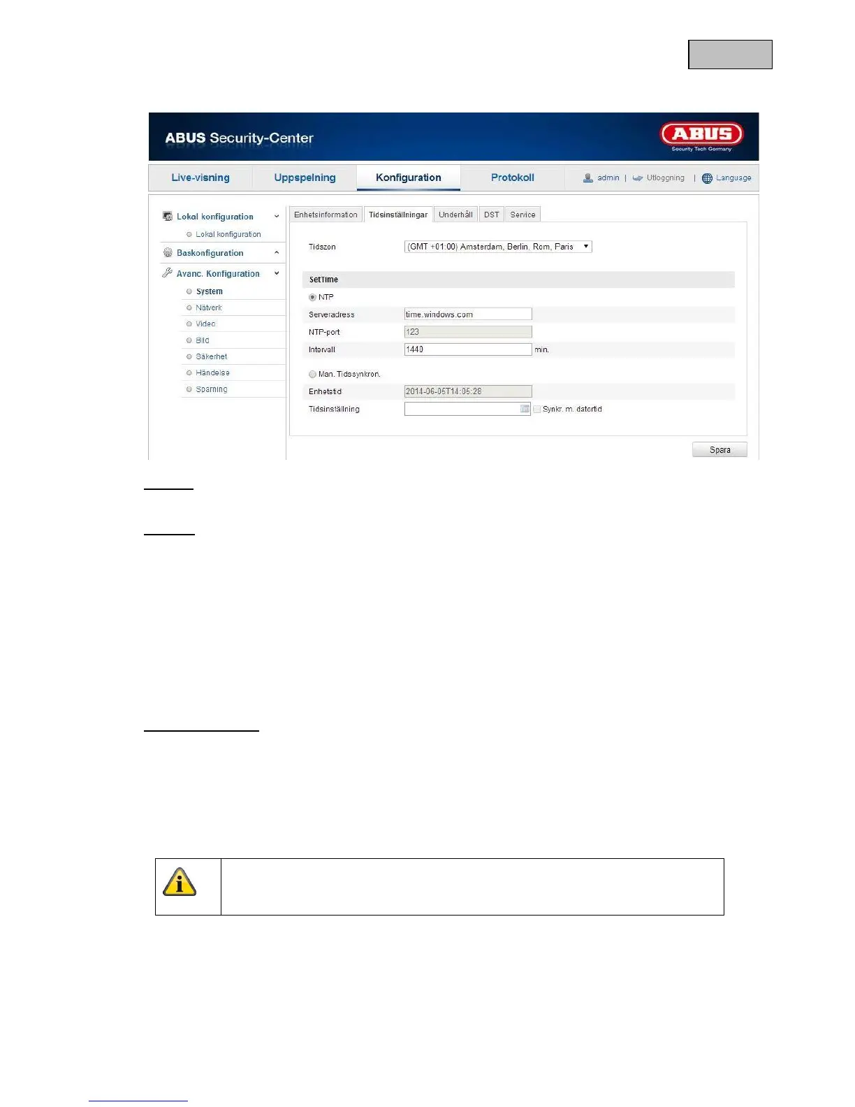 Med hjälp av Network Time Protocol (NTP) kan kamerans klocka synkroniseras med en tidsserver.