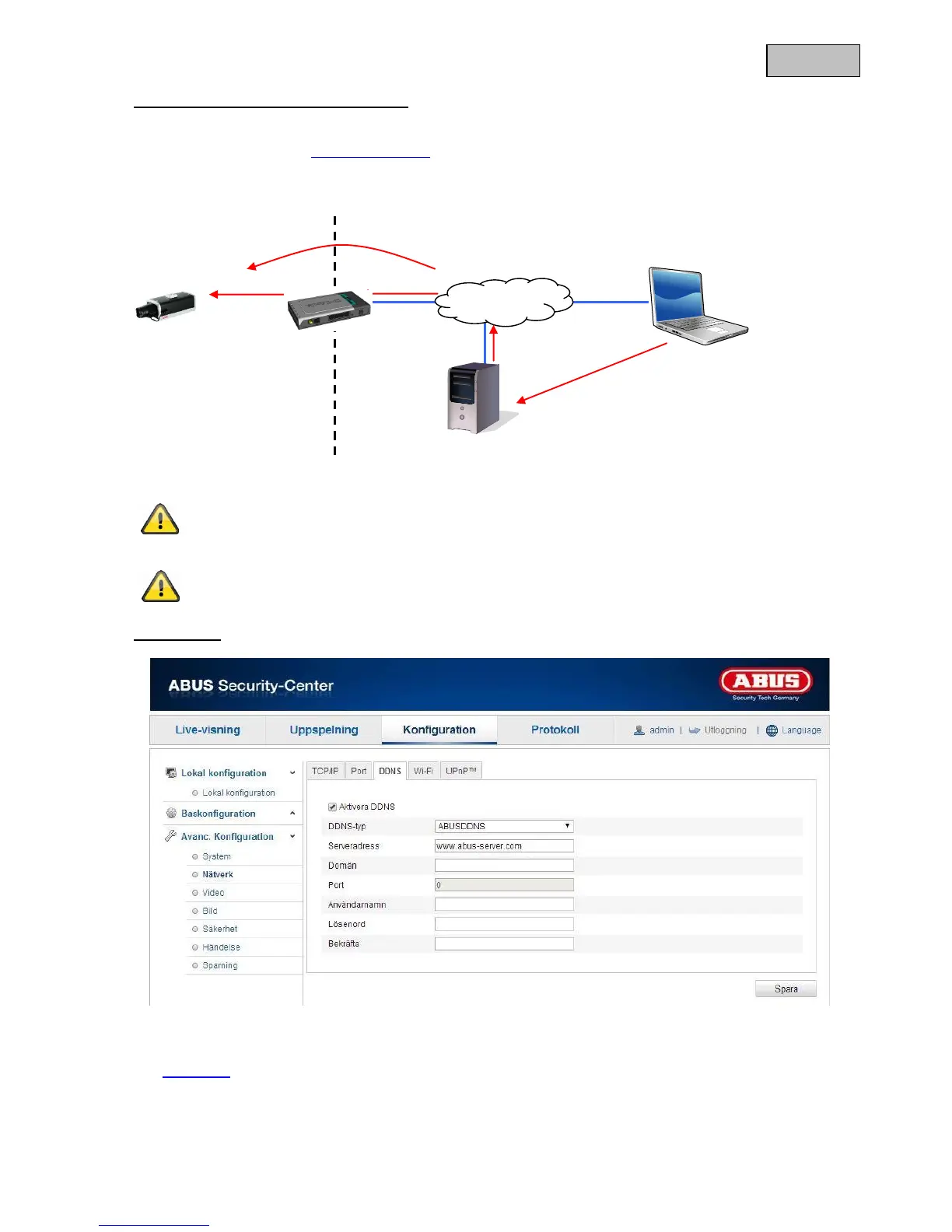 Om nätverkskameran är ansluten till en router, ska åtkomsten via DynDNS konfigureras i routern. På ABUS