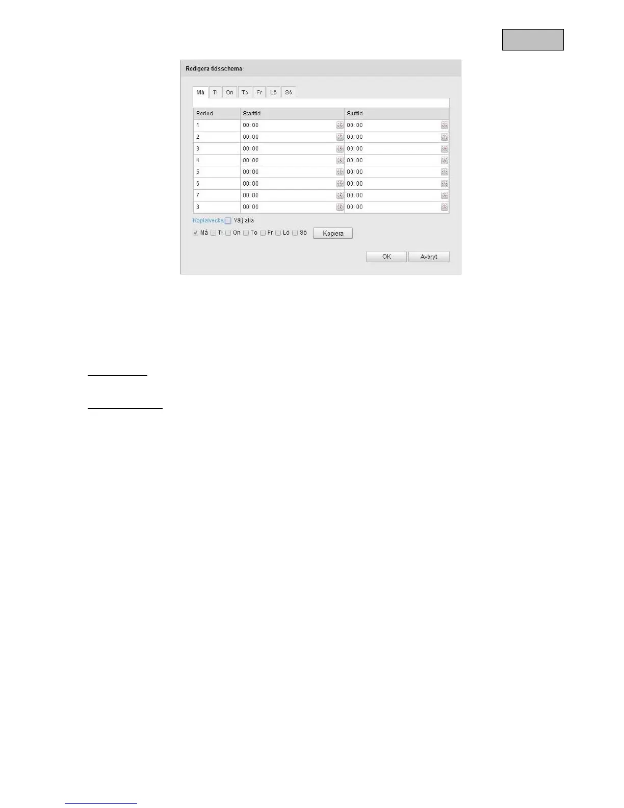 Om inställningarna ska gälla för alla veckodagar, markera kryssrutan ”Välj alla”. För att kopiera inställningarna