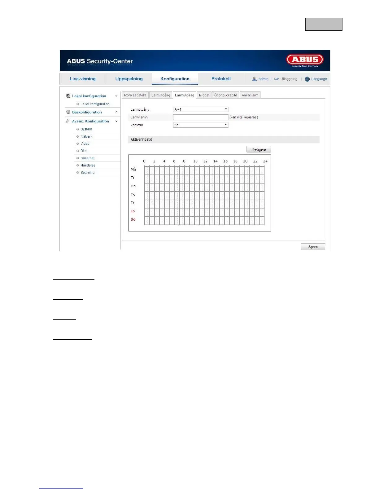 För att spara ett tidsschema för larmutgången, klicka på ”Redigera”.