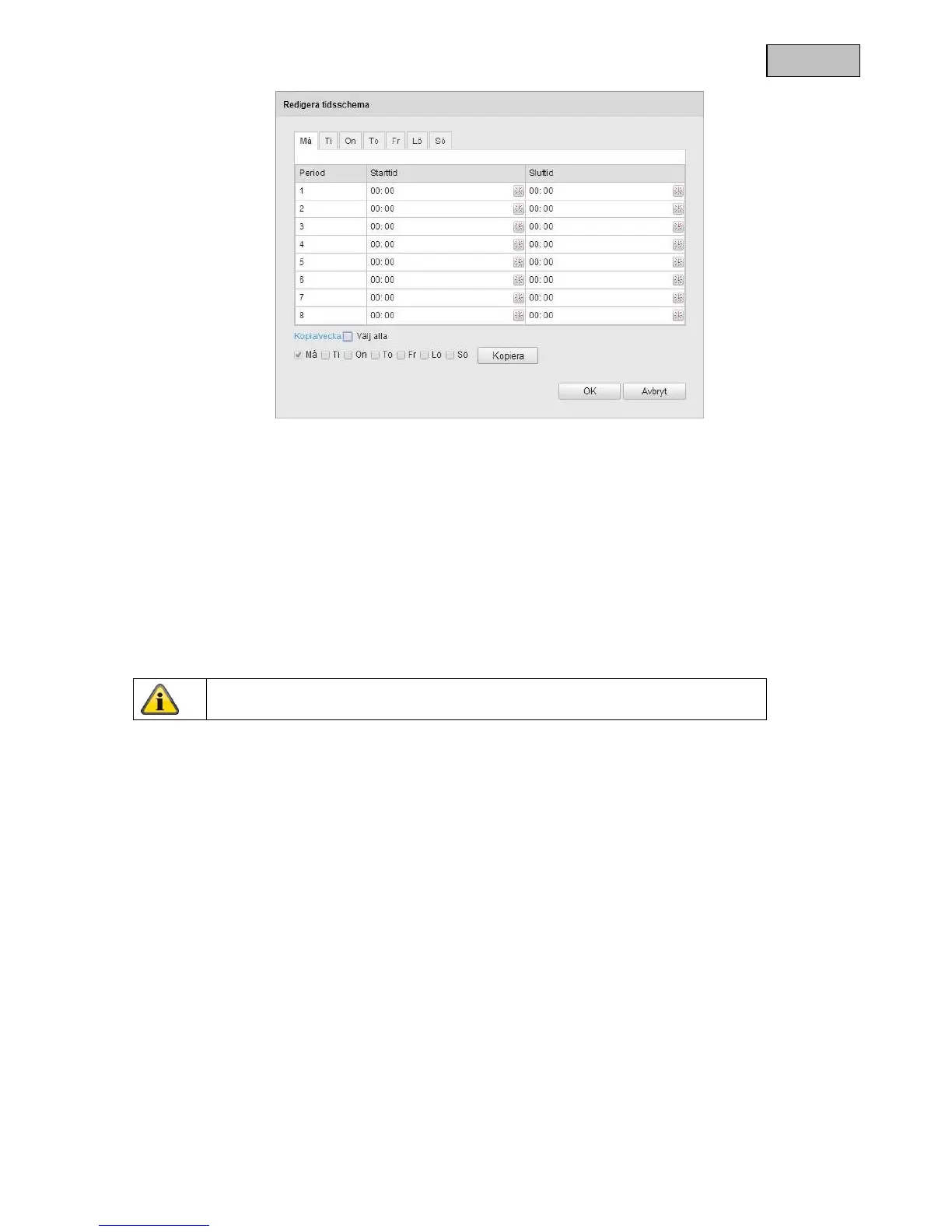 Om inställningarna ska gälla för alla veckodagar, markera kryssrutan ”Välj alla”. För att kopiera inställningarna