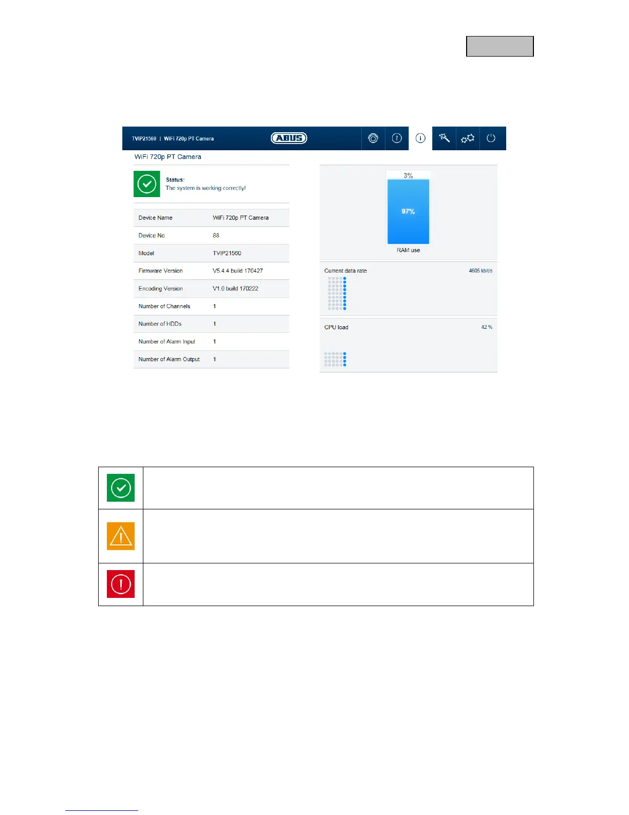The info page displays general information about the camera, e.g. installed firmware version or MAC