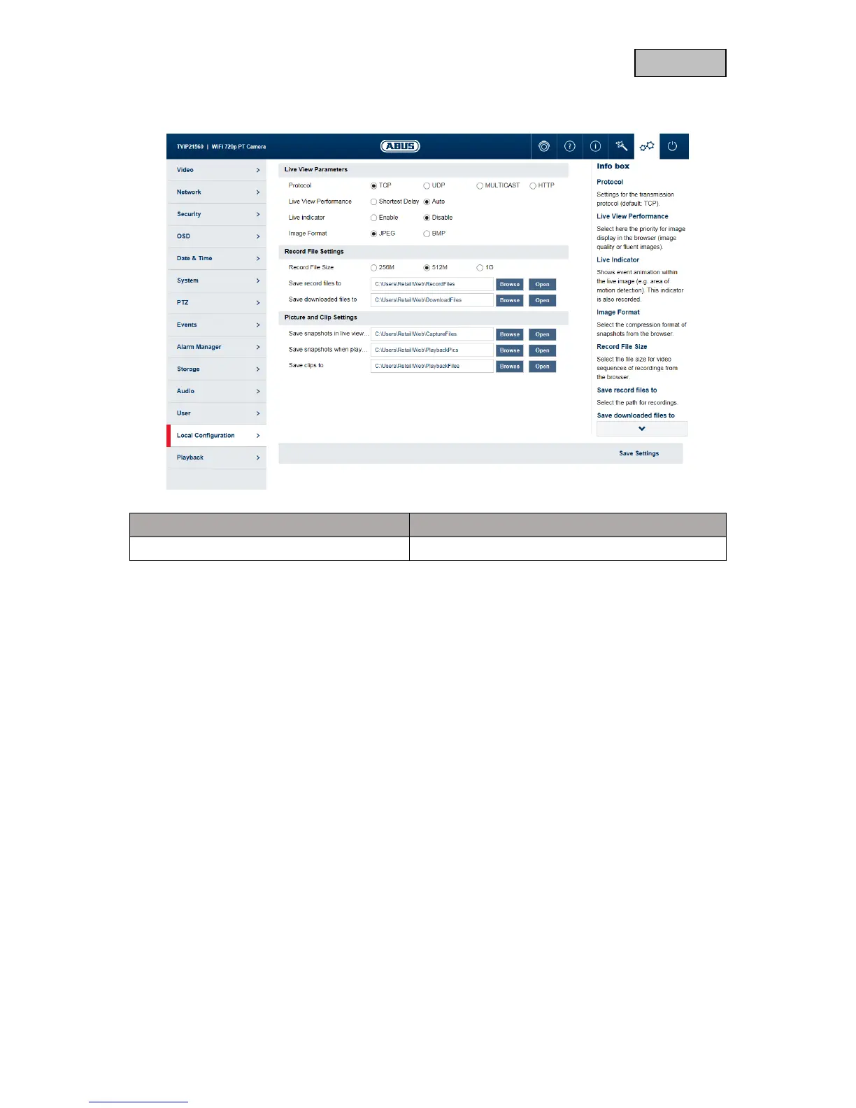 Record file size: Select the size of video sequences for saving videos using the browser