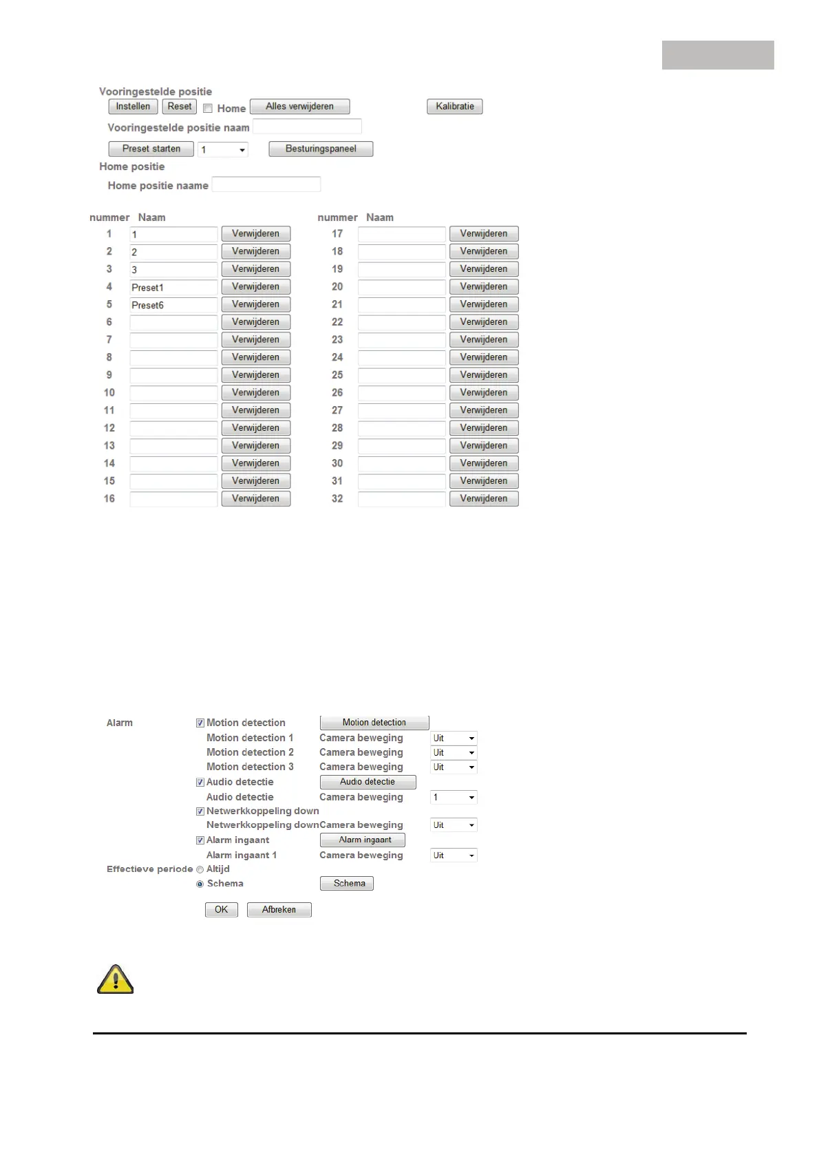 de eerder opgeslagen presetpositie in. Een knop voor het configureren van de betreffende alarmmelder