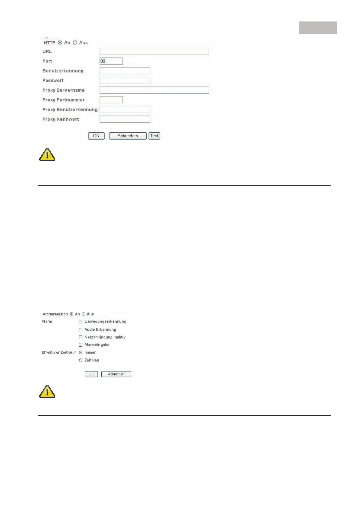 Alarm: Im Alarmfall können hier bestimmte Ereignisreaktionen für die HTTP-Übertragung